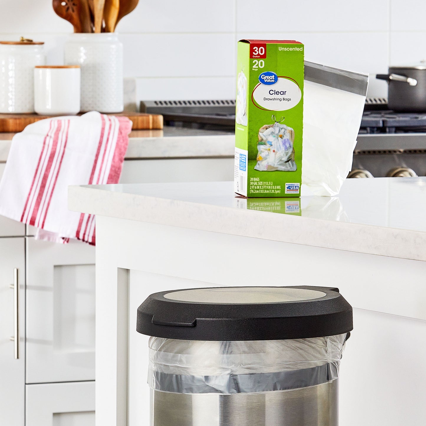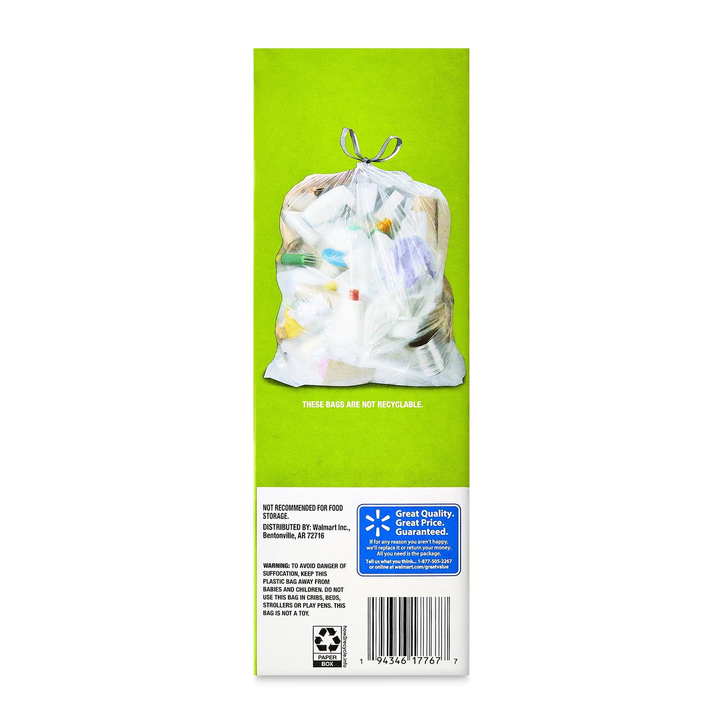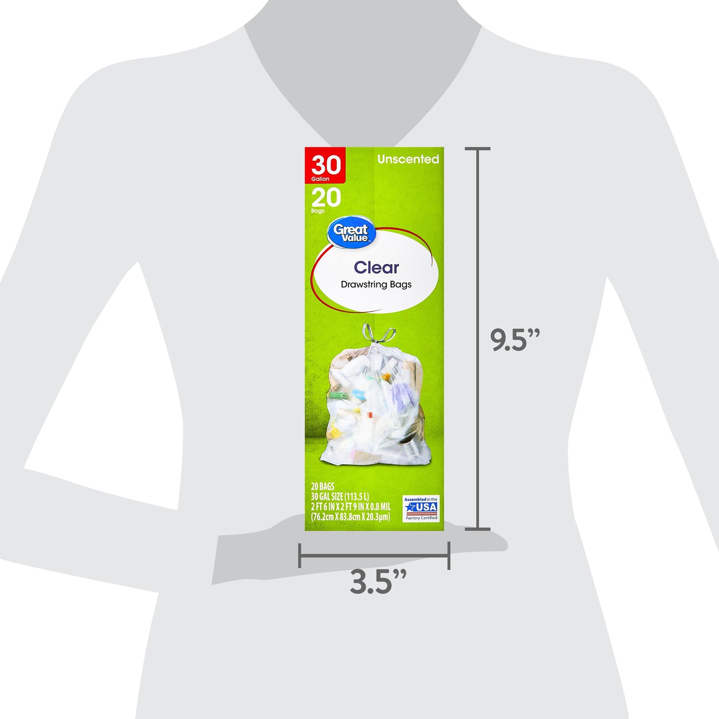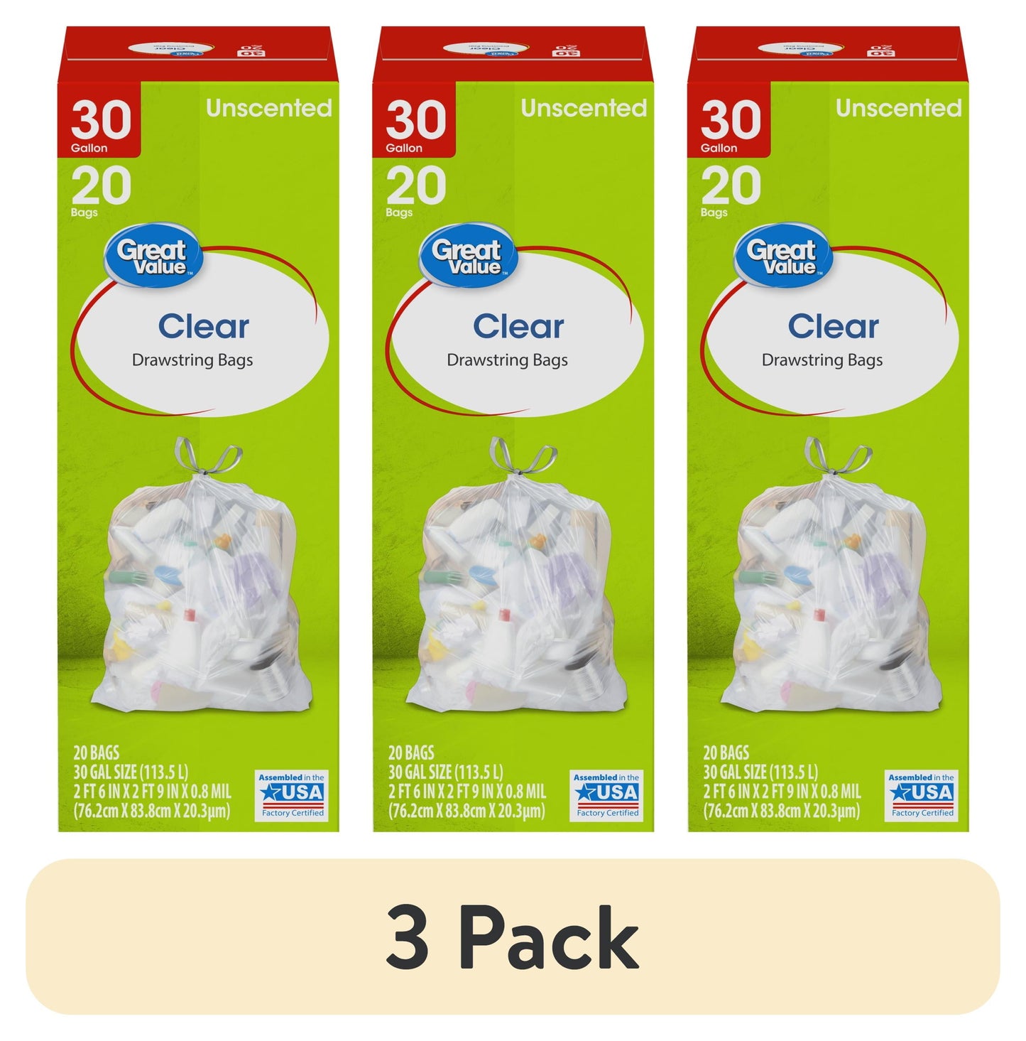 Get the strength and convenience you need for bigger cleanups with (3 Pack) Great Value 30-Gallon Clear Drawstring Large Trash Bags. Each pack includes 20 strong, tear-resistant bags, giving you a total of 60 bags to handle household, garage, yard, or event trash with ease.