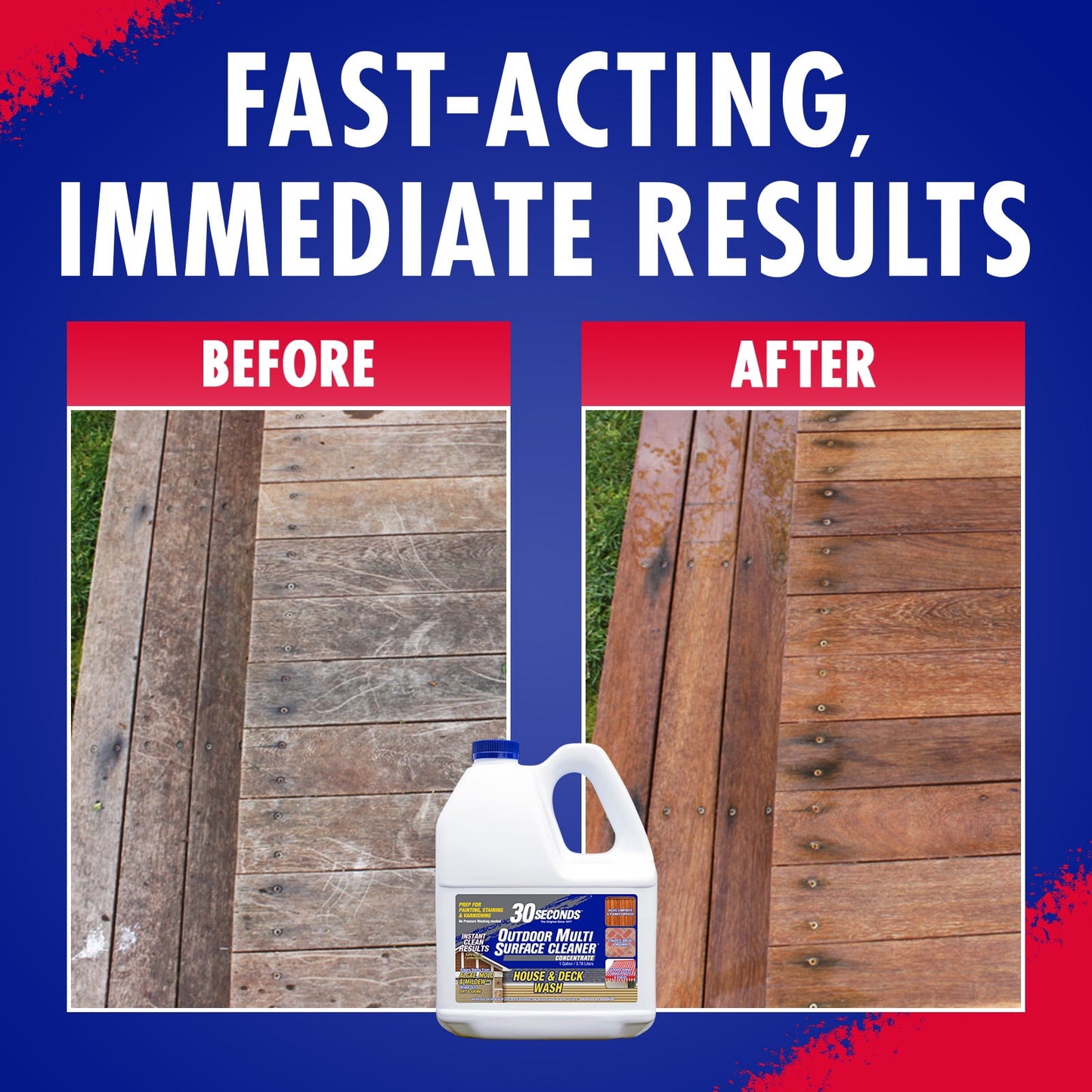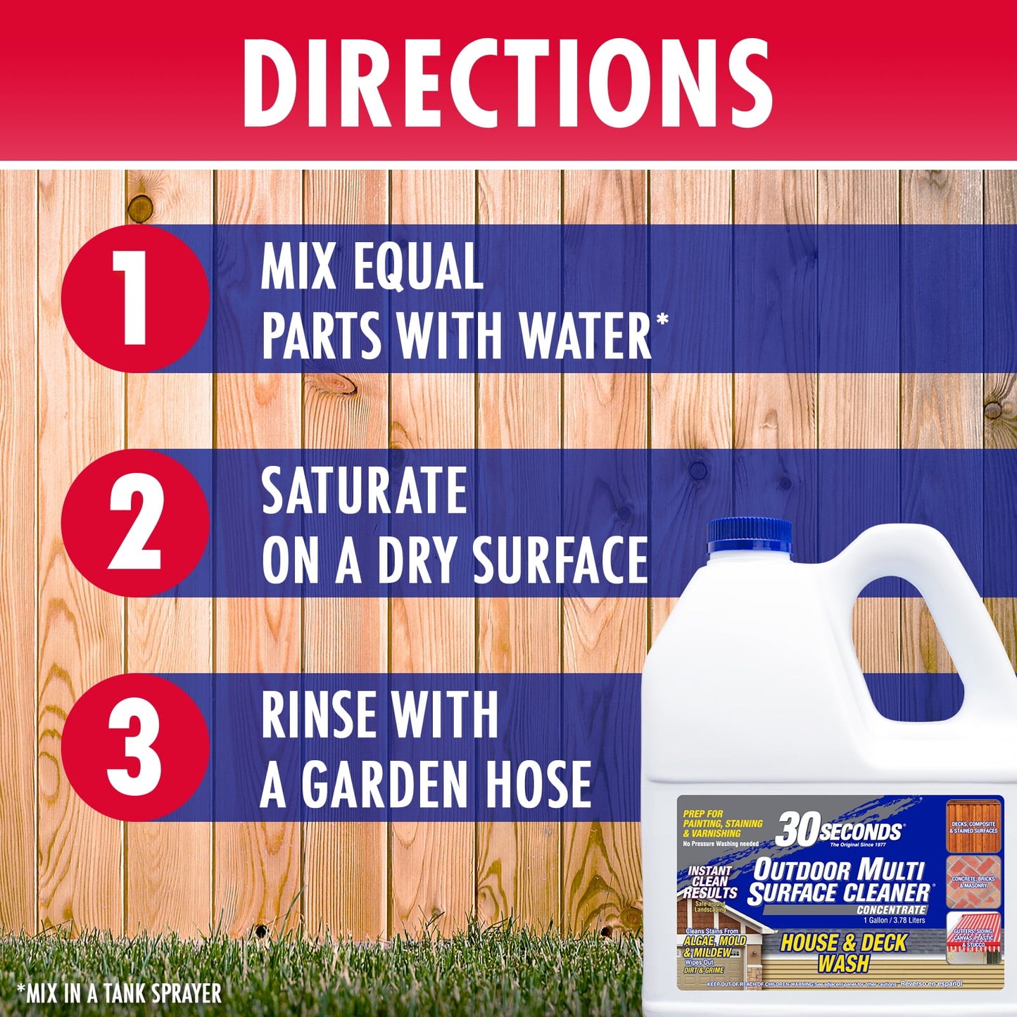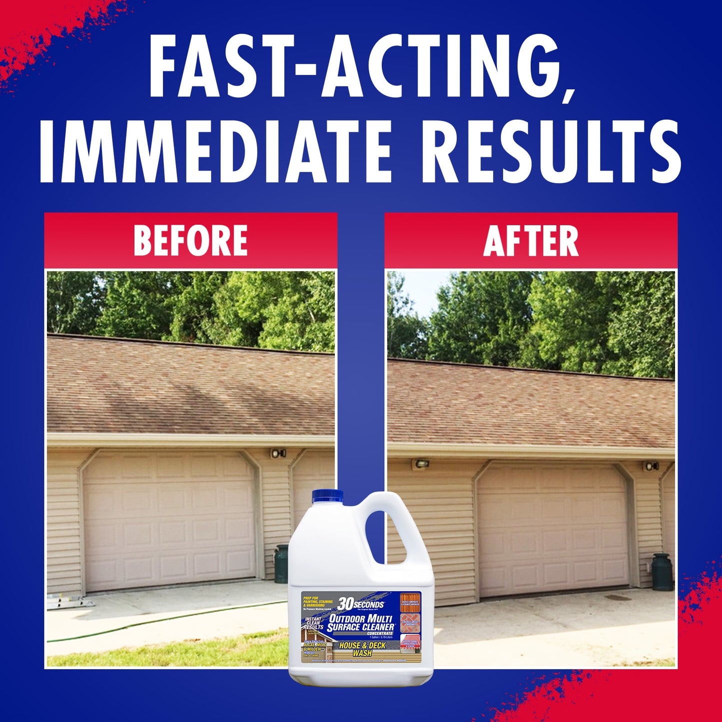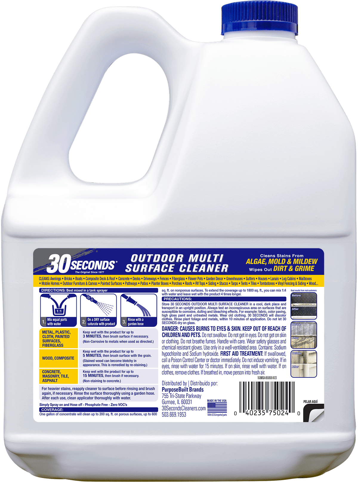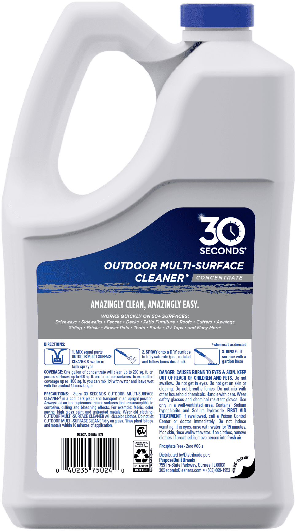 30 SECONDS Outdoor multi-surface cleaner is an easy to use, fast acting cleaner. A real multi-surface cleaner. From cleaning a garden gnome to preparation for painting, staining or varnishing. It cleans stains from algae, mold and mildew from nearly any outdoor surface. 30 SECONDS is formulated to keep soils and ions in suspension longer on vertical surfaces, giving a deeper clean and instant results without the need to pressure wash. Simply spray on, and hose off. Use to clean: Awnings, composite, driveways, flowerpots, gutters, log cabins, pathways, roofs, stucco, boats, concrete, fences, garden decor, houses, mailboxes, patios, RV tops, tarps, bricks, decks, fiberglass, greenhouses, lanais, mobile homes, siding and more!