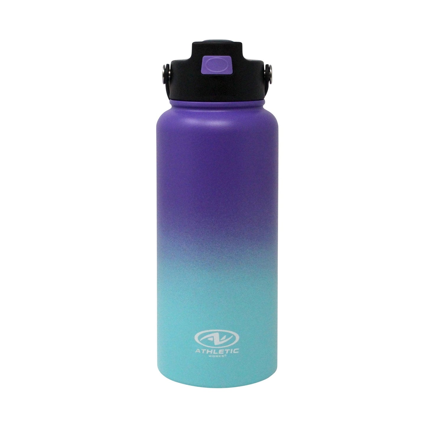 Stay healthy, hydrated, and ready to conquer your day with this Athletic Works 32 ounce SS Bottle w/Flip Straw Lid. The straw flips up with a convenient button on the lid and includes a handle that makes taking your drink to the gym, work, shopping or anywhere else easy. This trendy stainless-steel bottle is stylishly designed with a purple and teal ombre look. Don't pass up this great value on an Athletic Works 32oz stainless-steel bottle that will help you stay on track with your daily drinking goals!