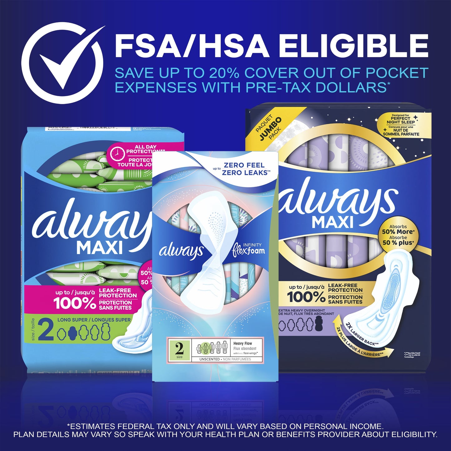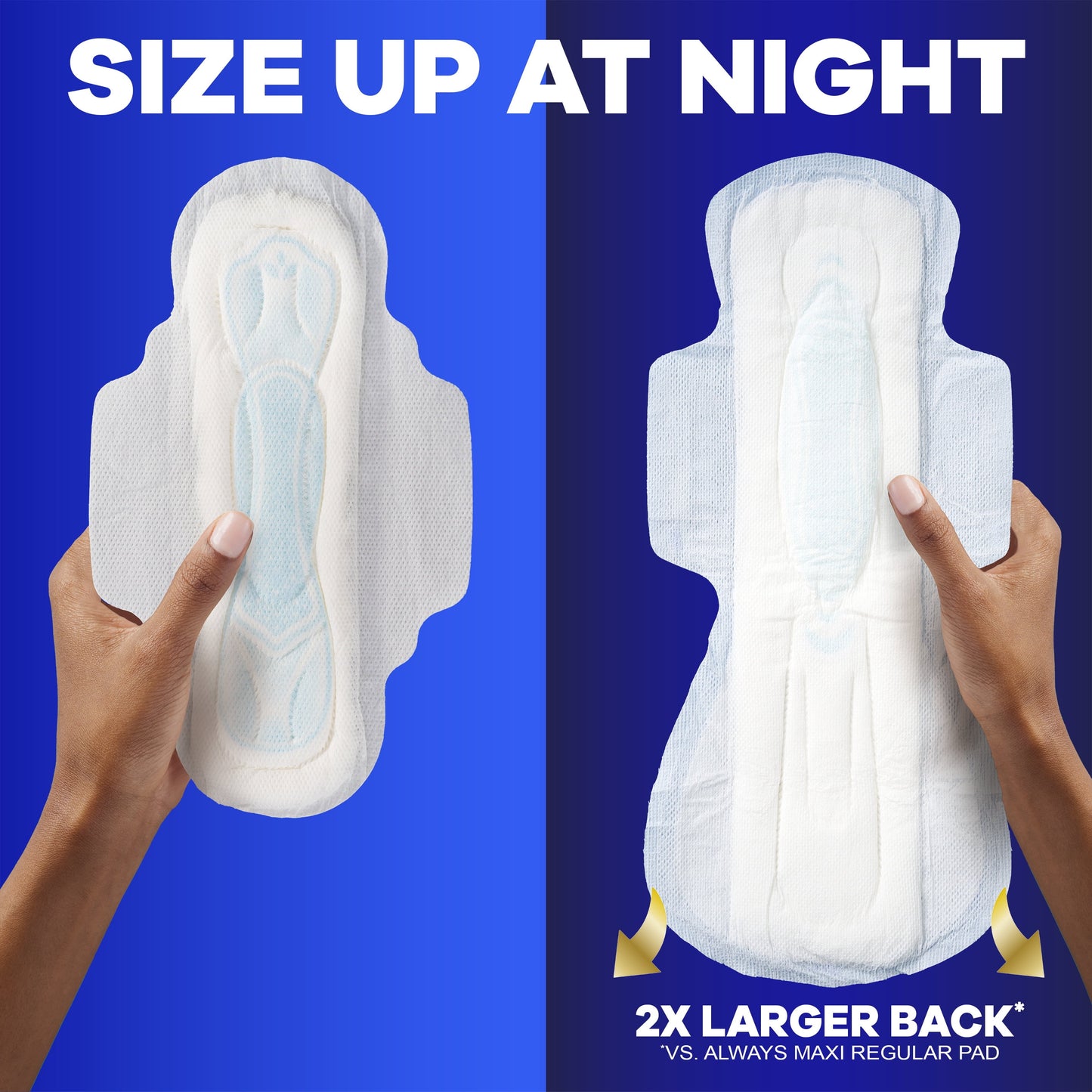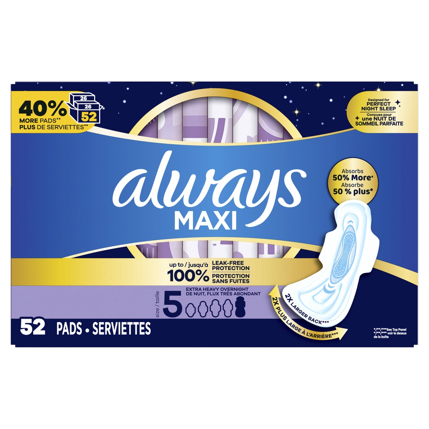 Rest easy with Always Maxi Overnight Pads with Wings for Women, Size 5, Extra Heavy Overnight Absorbency, Unscented (52 Count). Designed to handle extra heavy overnight flow, these pads feature a longer, wider back for maximum coverage while you sleep. The leak guard core locks in moisture to keep you dry, while the unscented design is gentle on sensitive skin. With secure wings to keep pads in place, you can enjoy worry-free nights and wake up feeling fresh. Always Maxi Overnight Pads provide reliable protection, comfort, and peace of mind every night.