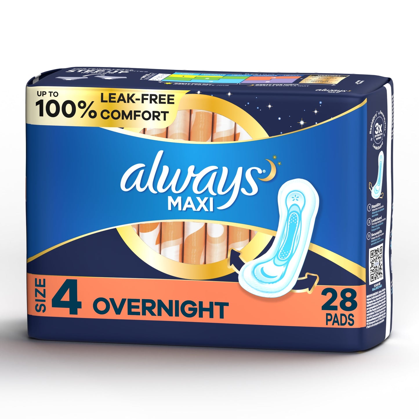 Get all-night protection with Always Maxi Pads Without Wings, Size 4, Overnight Absorbency, 28 Count. Designed for overnight use, these maxi pads offer extra coverage and reliable absorbency to keep you feeling dry and secure while you sleep.