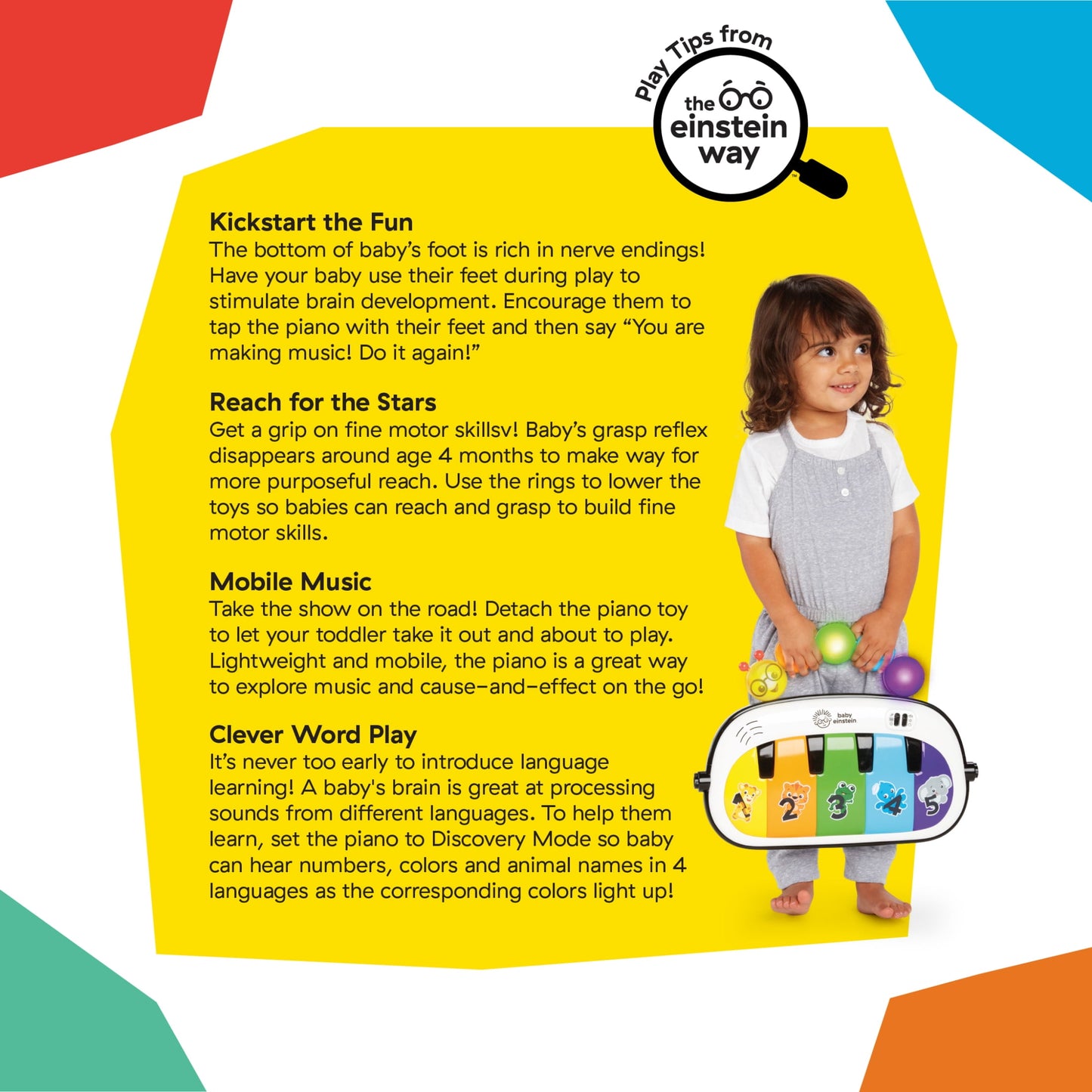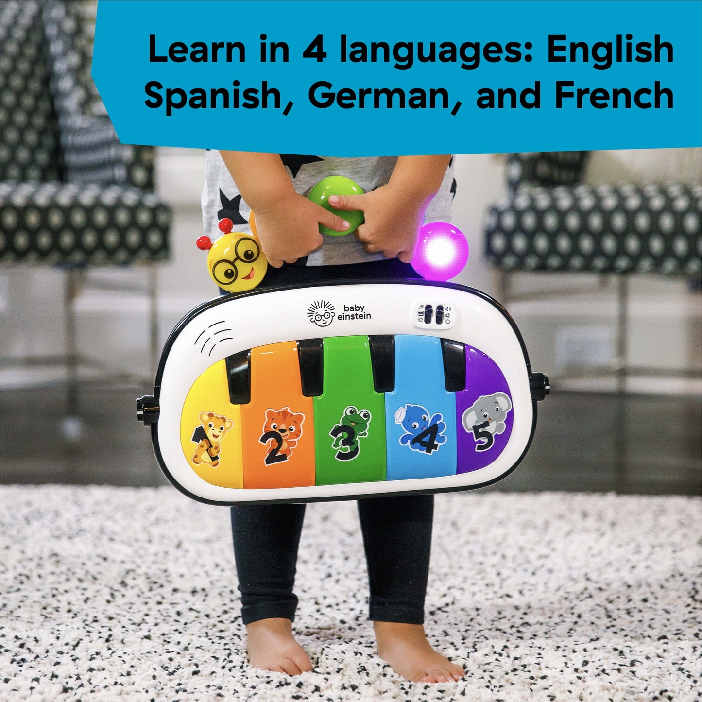 - Piano toy features 2 modes of play: Free Play piano mode and Melody mode, introduces phrases in 4 languages: English, Spanish, French and German, bring the piano on the go