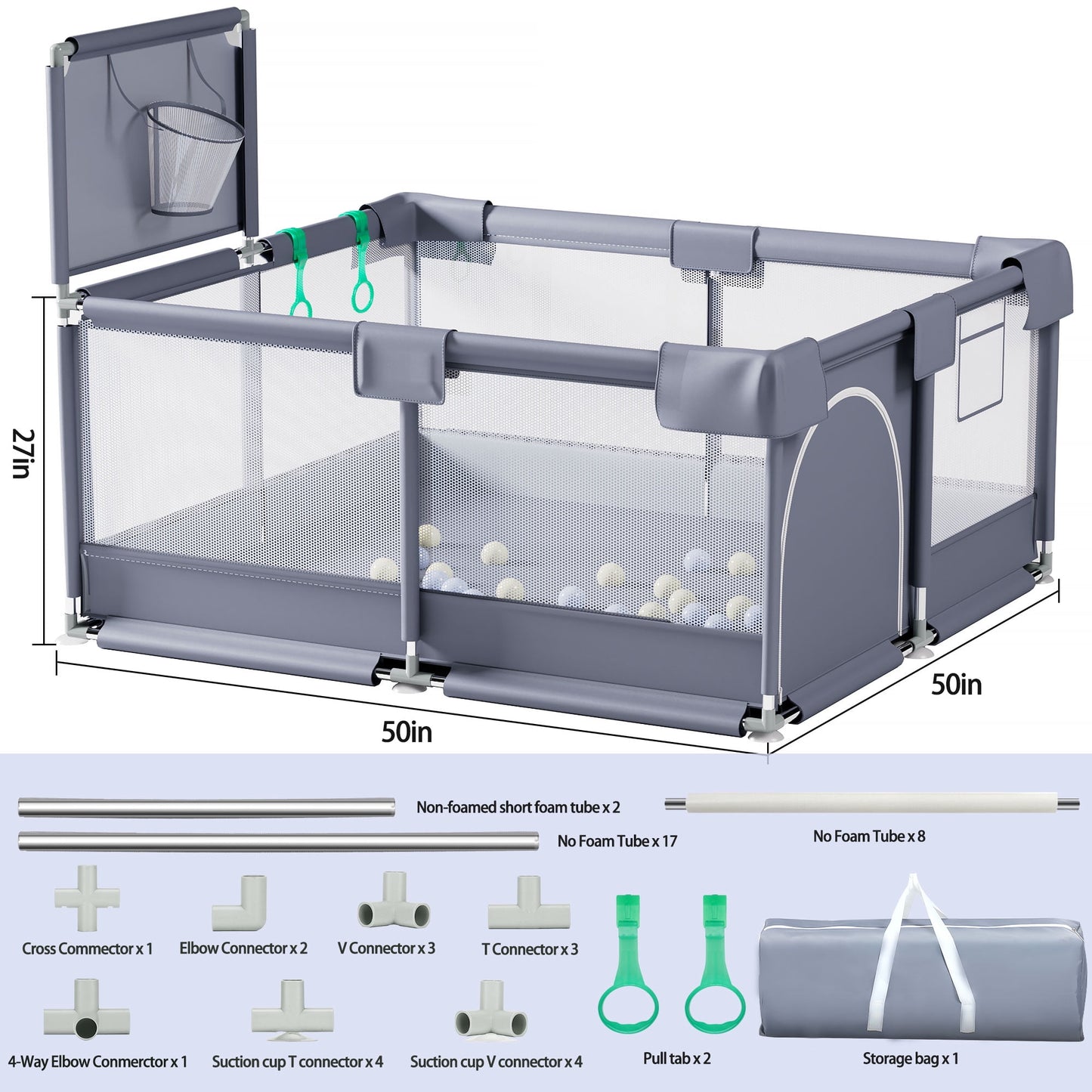 Babyeap Baby Playpen, 50"x50" – Safe Travel Play Yard for Toddlers with Storage Basket, Gray