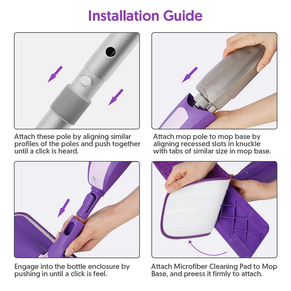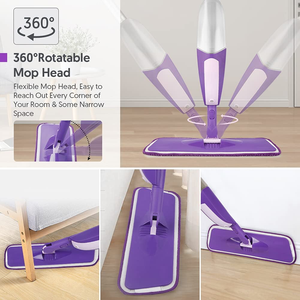 - No Bend Over and Save Your Back: The floor mop with sprayer have 125 cm poles, you only need to press the trigger on the handle to get the water mist. Our hardwood floor mop has a 360° rotate mop head, which could reach any crevices, and deep corners under the furniture easily. Such as tile walls, windows, under beds or etc. No bend-over Ever. Saving your back makes cleaning more comfortable.