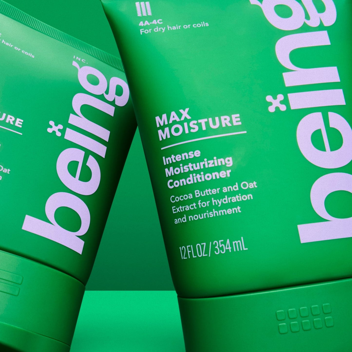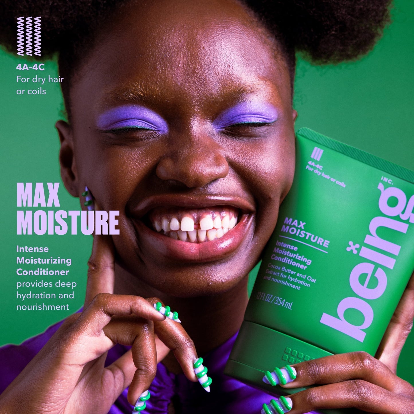 Being MAX MOISTURE Intense Moisturizing Conditioner is for adults with hair in need of an intense hydration boost, whether coily (type 4A-4C) or otherwise dry. This dermatologically tested, sulfate-free and silicone-free formula contains naturally derived ingredients such as Cocoa Butter and Oat Extract to combat dryness, providing deep nourishment and soft definition to dry hair or coils. Packaged in a convenient tube with a squeeze dispenser for easy use. Being is a community-led hair care brand created to meet all hair types exactly where they are. The range works to finesse and de-stress what you have, rather than trying to turn it into something it's not. Whether you’re curly + coarse or fine + flat, help unlock hair that makes you feel more you—for less doing and more Being.