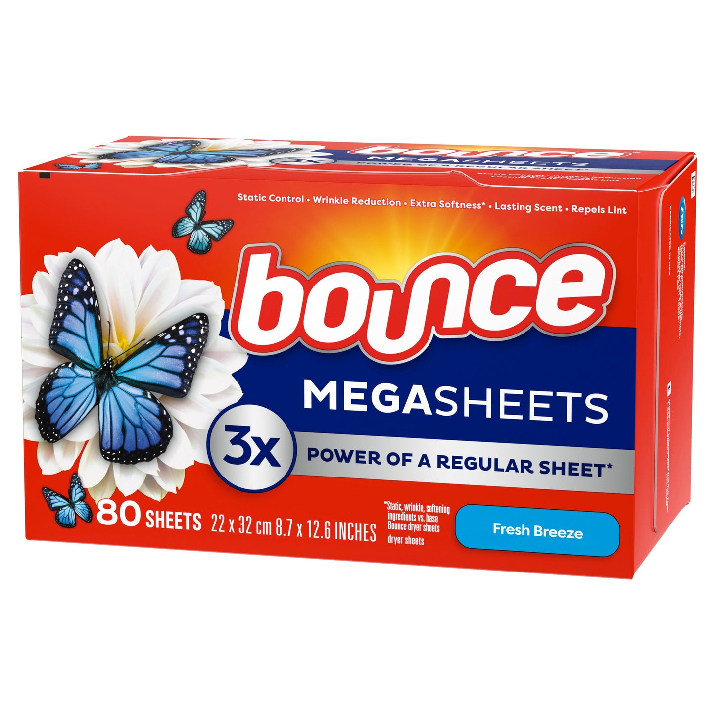 - Includes one 80 count box of Bounce Mega Dryer Sheets in the Fresh Breeze scent.