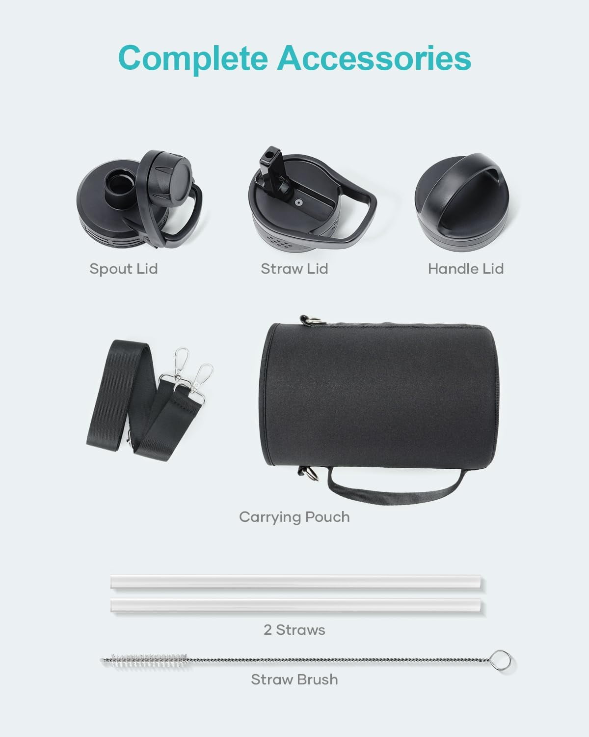 - Flexible Drinking On-the-Go: This half gallon water jug comes with 3 different lids. The screw-on lid with flip-up handle is for easy ice refilling with superior portability; spout lid makes it convenient to drink hot liquid and straw lid for sipping cold.