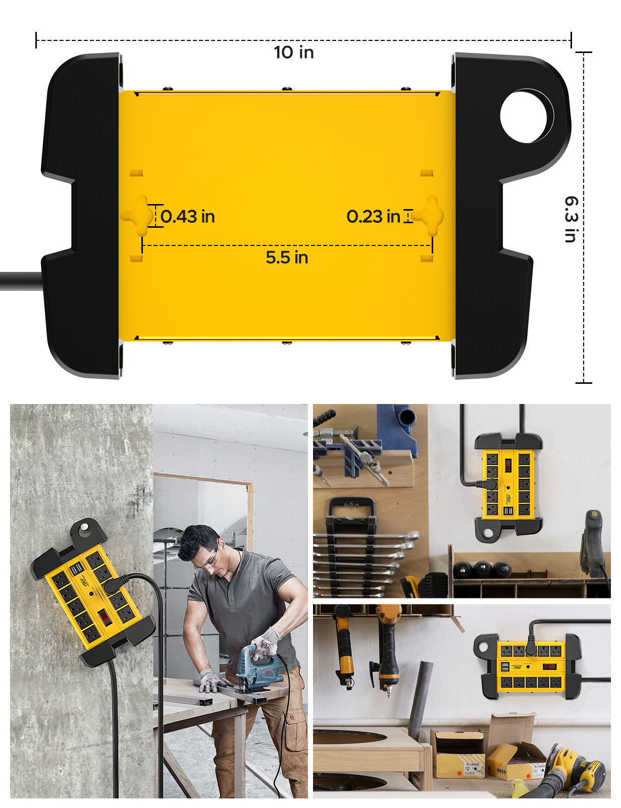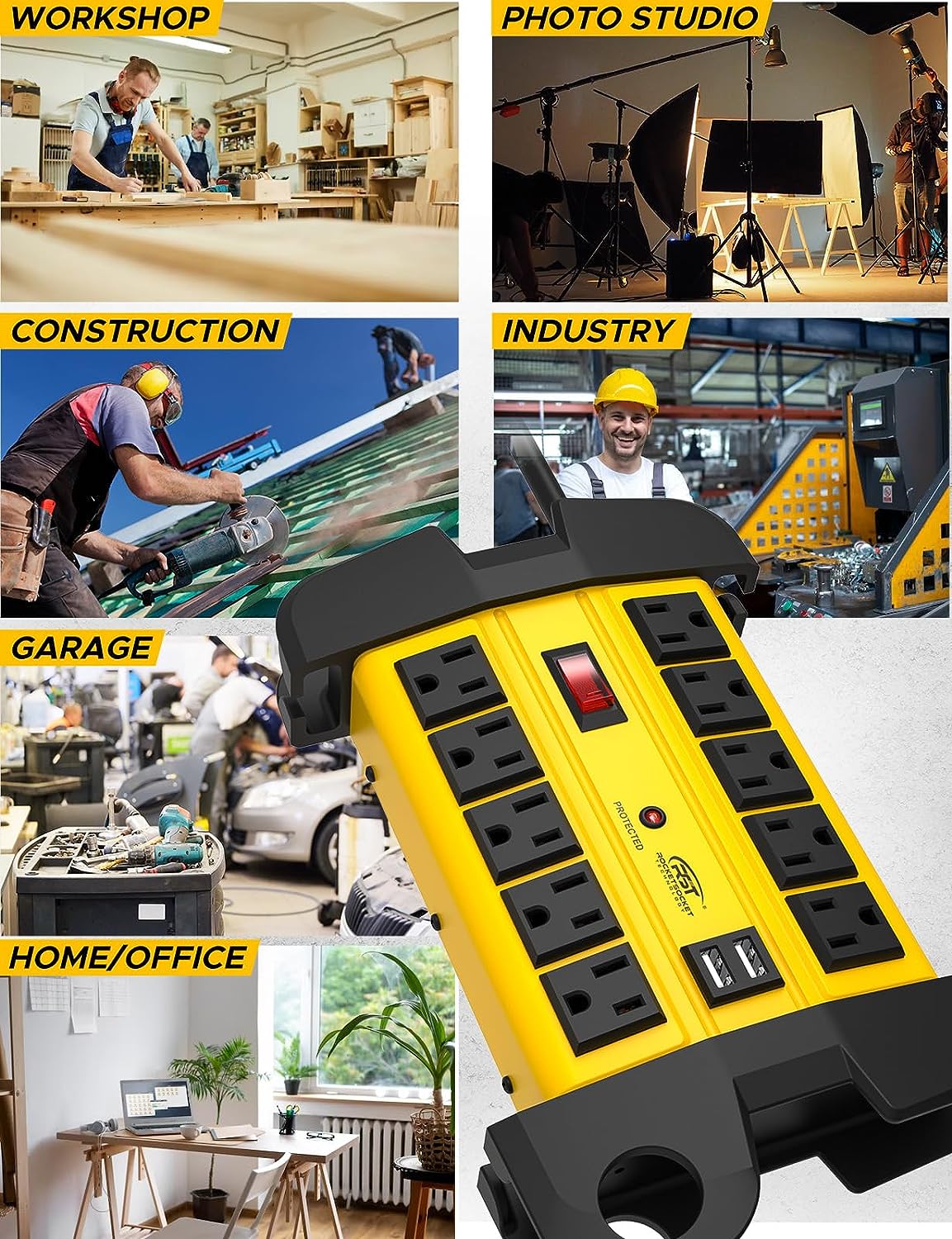 - [Long 15FT Cord with 14AWG]: Featuring a 15FT long heavy-duty 14AWG cable, this power strip offers flexibility in placement and easy access to power sources in garages, workshops, and other demanding environments. Experience the convenience of an extended cord for all your power needs.