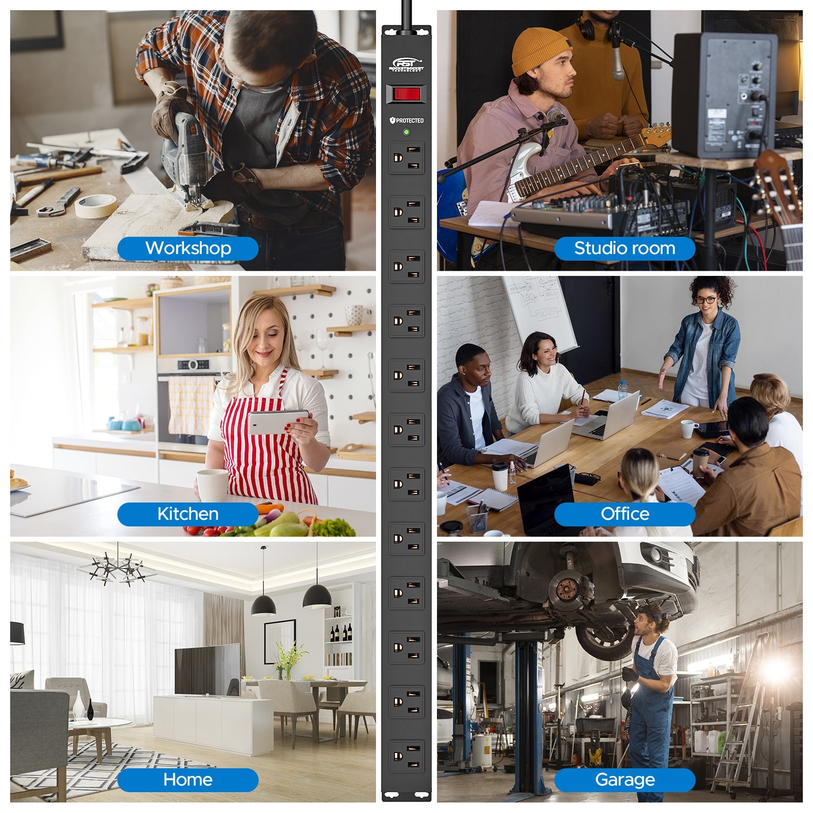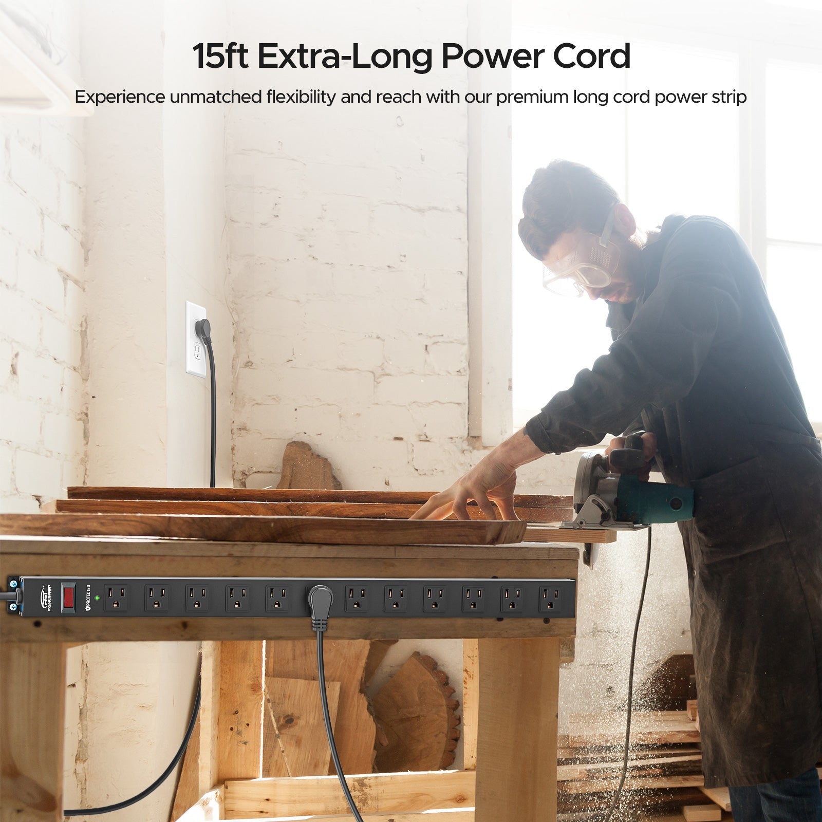 CRST 12 Outlets Wide Spaced Mountable Metal Power Strip Surge Protector, Optional 15FT or 6FT Flat Plug Power Cord