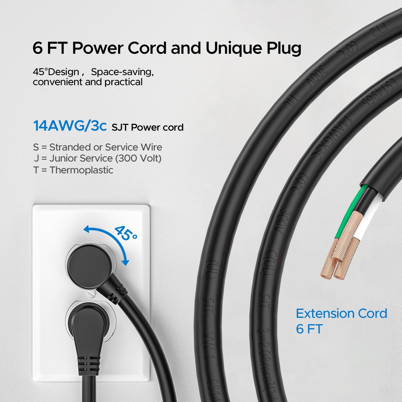 - Slim metal design with 1.5mm extra-thick aluminum alloy and reinforced plastic. This ensures extreme strength and durability. The 6FT UL-listed extension cord offers superior corrosion and oil resistance. It supports a 15AMP/14AWG SJT grade wire, handling up to 1875W power.