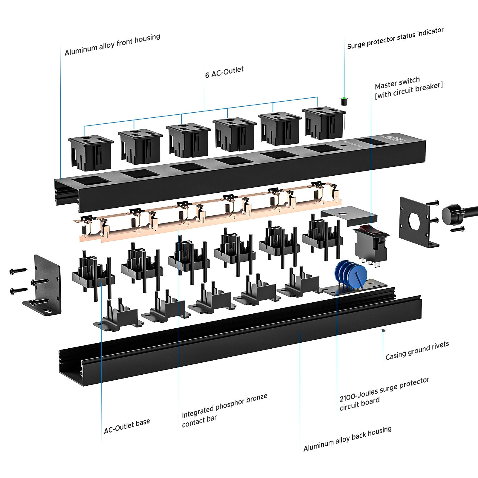 - With 2100 joules of protection, this strip guards against surges, spikes, and outages. A 15Amp circuit breaker reacts instantly to overloads, providing maximum protection. It's SGS certified for reliability.