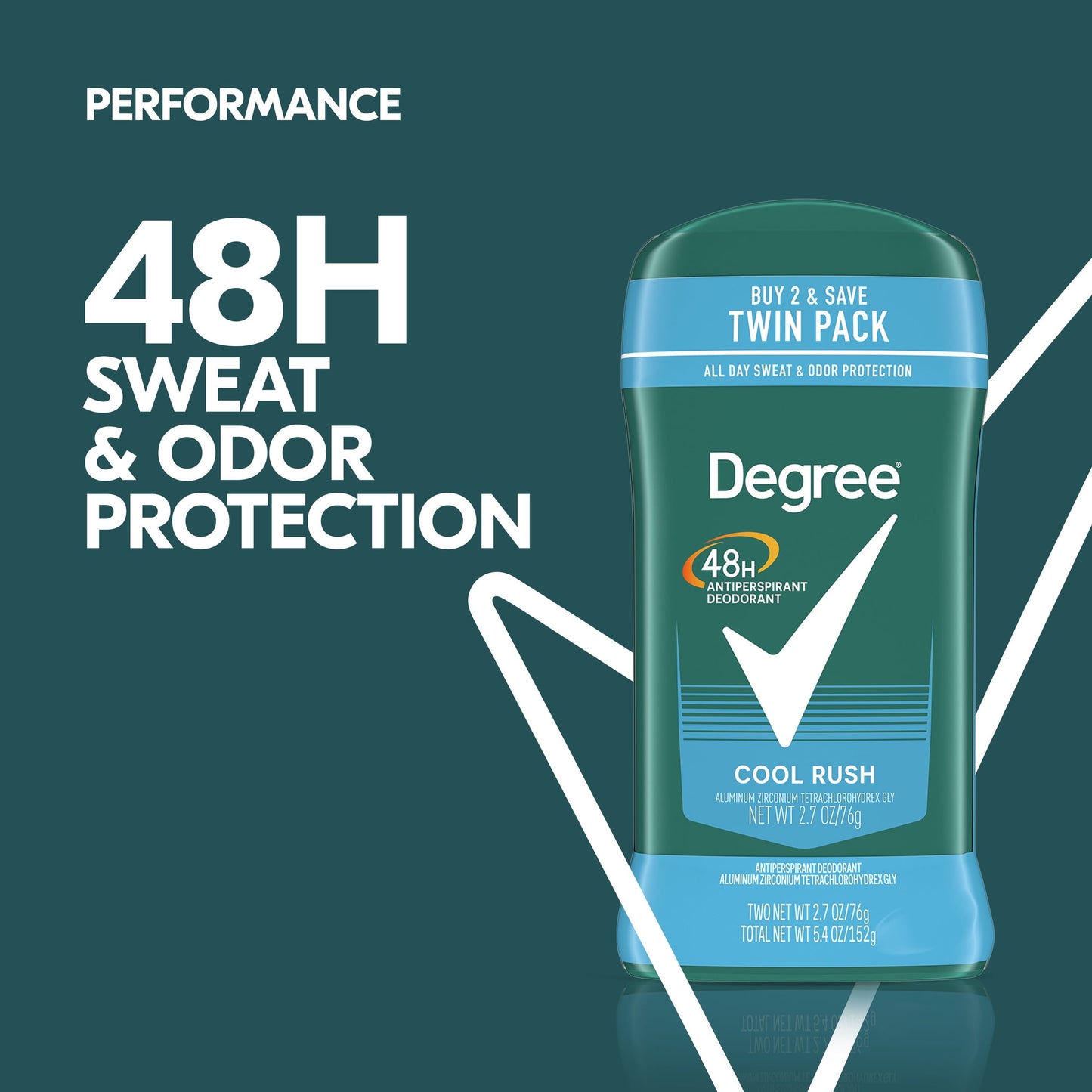 Degree Men Original Antiperspirant Deodorant for Men Cool Rush Twin Pack, 2.7oz. Degree Men Cool Rush Antiperspirant Deodorant delivers 48-hour sweat and odor protection to keep you feeling dry and fresh. This antiperspirant deodorant for men works as hard as you do and offers 48-hour protection, so you can take on the day. Our Cool Rush Antiperspirant Deodorant features a refreshing kick of crisp, arctic freshness. The powerful antiperspirant deodorant responds when you need it most, so you can stay confident without having to worry about slowing down. You can be confident you’ll be protected from sweat and odor by this antiperspirant for men. Stay fresh and feel clean from morning to night. Simply twist, glide and get moving. The crisp, energizing scent helps to keep you as fresh as when you started your day. Stay dry, cool, and confident thanks to Degree Men Cool Rush Antiperspirant Deodorant. At Degree, we want to inspire the confidence in everyone to move more and go further. We’re here to support your journey through an antiperspirant that moves with you and helps you go beyond your limits. As well as increasing our use of reusable materials, we’re making it easier for you to recycle our antiperspirant and dry spray packaging. Degree. It won’t let you down.