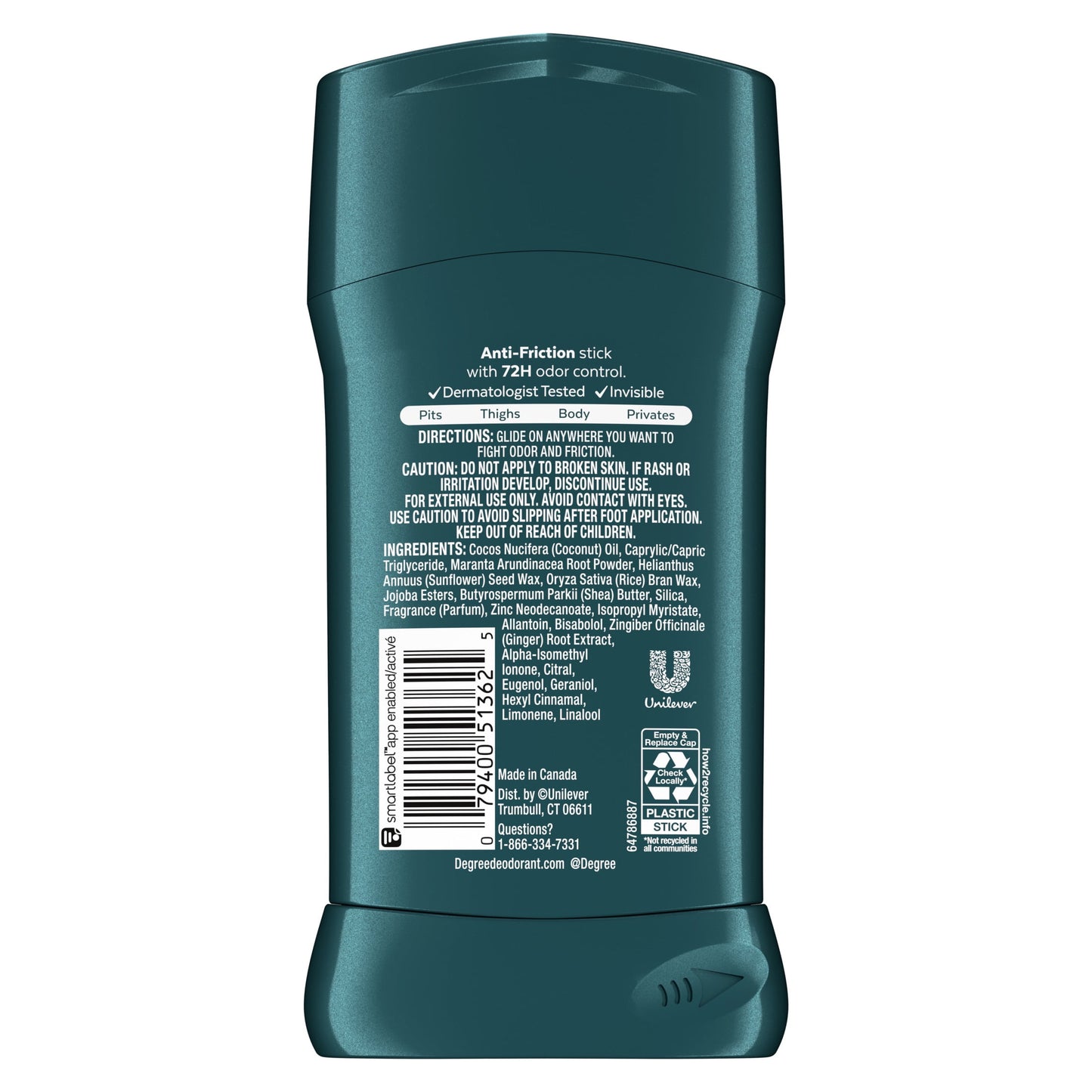 Degree Men Whole Body Deodorant Stick for Men Ocean Rush Scent Aluminum Free, 3 oz. Stay fresh and confident with Degree Men’s Whole Body Deodorant Stick. This powerhouse deodorant is as affordable as it is effective: it delivers up to 72 hours of odor protection, ensuring you smell great everywhere without breaking the bank. This versatile deodorant is designed for use anywhere you want to tackle odor – from your pits to your privates, body, and feet. Formulated with arrowroot powder to help absorb sweat. It’s simple and easy to apply, gliding on smoothly without leaving a sticky feel. Plus, it features a fresh scent with a dynamic and clean feel, so you can smell amazing all day long.Degree’s Whole Body Deodorant is dermatologist tested and aluminum free. Whether you’re hitting the gym, running errands, or just going about your day, Degree’s Whole Body Deodorant Stick keeps you feeling fresh everywhere. For adult use.