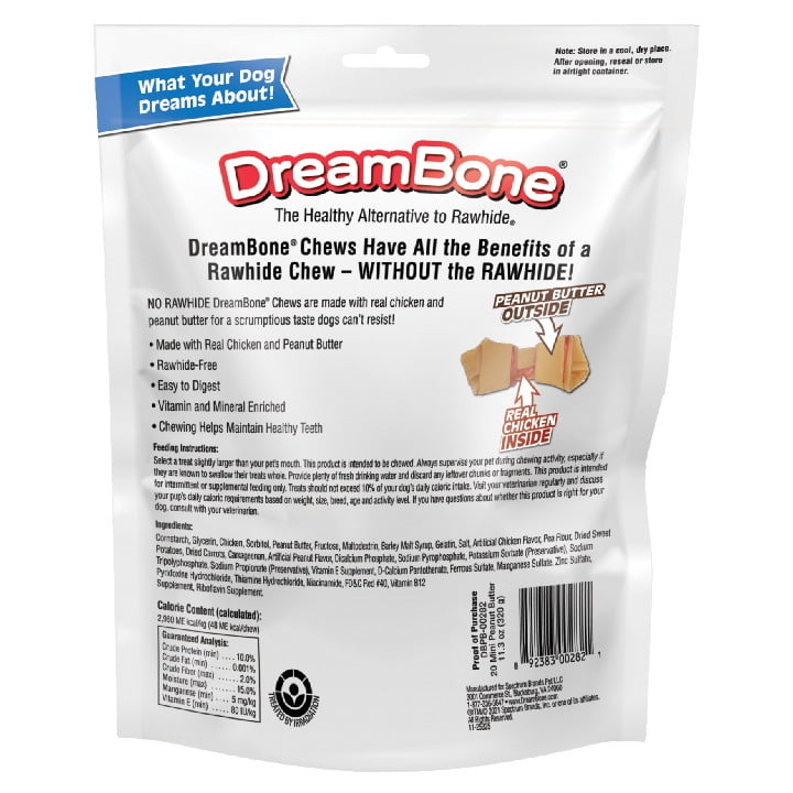 reat your pup to a delicious and safe chew with DreamBone Peanut Butter Flavored Mini Bones. Made without rawhide, these tasty chews are easy to digest and packed with a rich peanut butter flavor dogs love. Perfectly sized for small dogs, they help satisfy natural chewing instincts while promoting dental health.