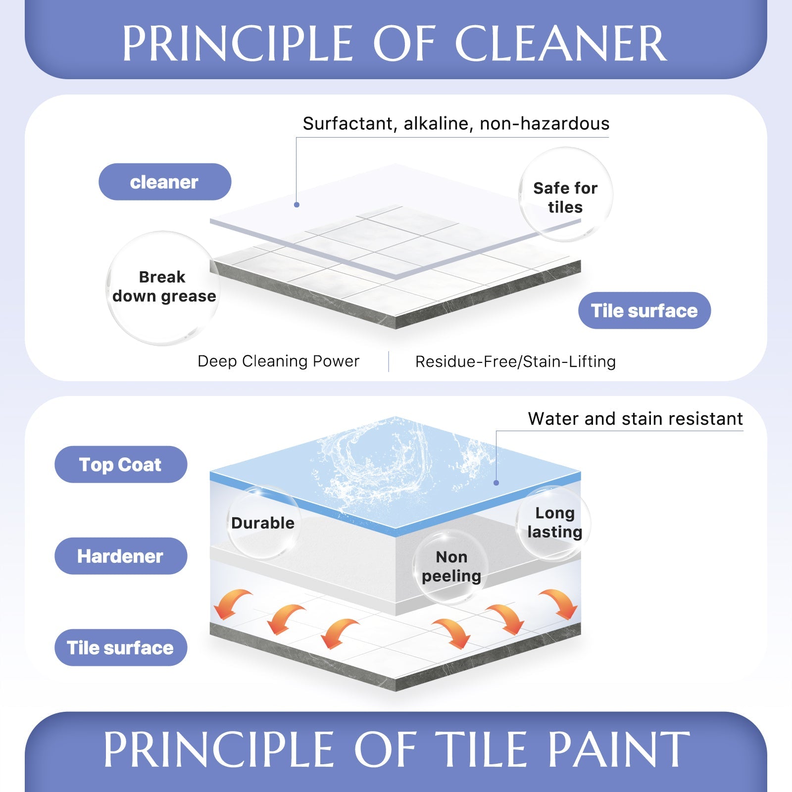 Surface Treatment Solution: Helps remove impurities, glaze, and wax from the original tile surface, improving adhesion for better paint performance.