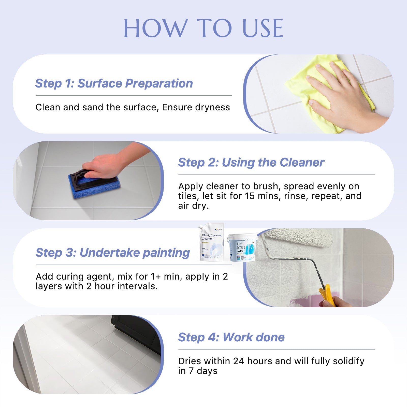 【All-in-One Kit】Our all-inclusive tile refinishing kit is designed to provide everything you need to complete your project with professional results. This tile paint covers 40-50 sq.ft, Cleaner can clean 100-200 sq.ft(We recommend that you use it twice for best results.)