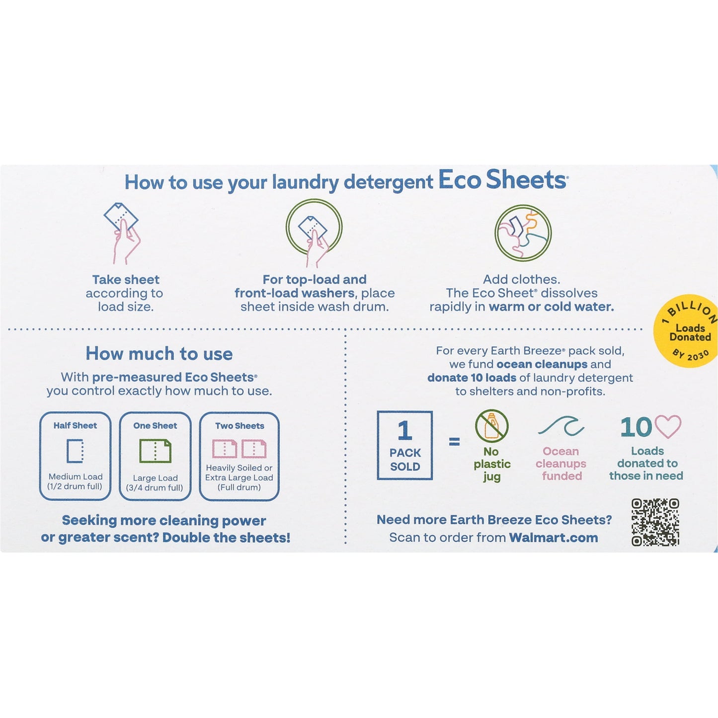 Did you know 91% of plastic doesn't get recycled? That's why Earth Breeze is sustainably packaged, meaning no plastic jug! The lightweight cardboard packaging, with 14 sheets per pack for up to 28 loads, saves space in the laundry room as well as landfills and oceans. For every purchase made, Earth Breeze helps fund ocean cleanup efforts and donates 10 loads of laundry detergent to a variety of charitable causes. Over 225 million loads have been donated and counting!