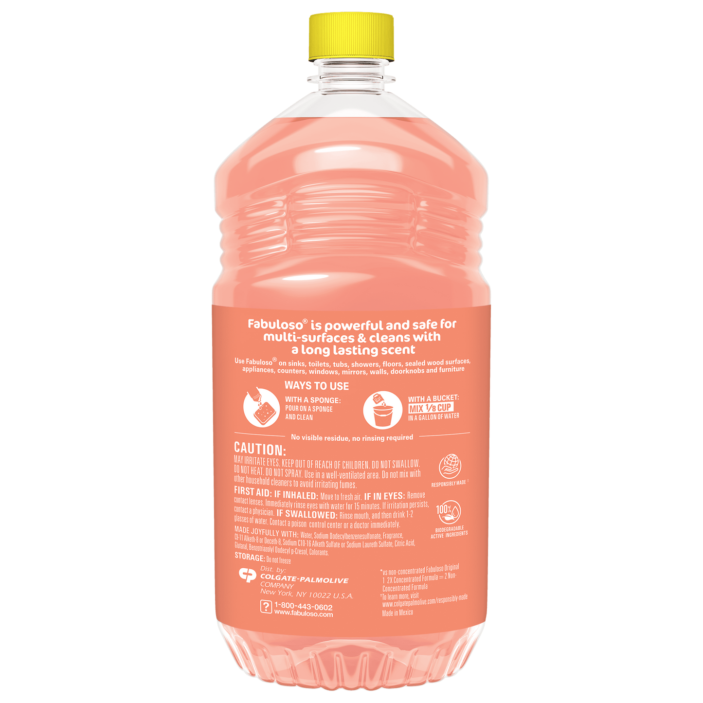Fabuloso Multi-Purpose Cleaner is powerful and safe for multi-surfaces and cleans with a lasting scent. Fabuloso 2X concentrated formula provides 2X more uses in the same bottle compared to non-concentrated Fabuloso Original. Fabuloso 2X Peach fills your home with long-lasting freshness and a sparkling peach scent with notes of fresh-picked violet and coconut. It can be used as a kitchen cleaner and on a wide range of surfaces including sinks, toilets, tubs, showers, floors, sealed wood surfaces, appliances, counters, windows, mirrors, walls, doorknobs, and furniture. Fabuloso Multi-Purpose Cleaner also doubles as a powerful floor cleaner concentrate, making it perfect for tackling dirt and grime on a variety of floor surfaces with ease. Fabuloso’s 2X concentrated formula also acts as a no rinse floor cleaner, allowing you to clean floors effortlessly without leaving behind any residue when diluted per instructions. Our 2X concentrated formula provides 2X more uses and 2X more active ingredients vs. non-concentrated Fabuloso Original. Plus, by following dosing instructions, you can use 50% less plastic while enjoying twice as many uses from the same size bottle as Fabuloso Original. For best results, use Fabuloso cleaning products safely by following the label instructions. Mix 1/8 cup in a gallon of water or apply directly onto a sponge for a thorough clean.