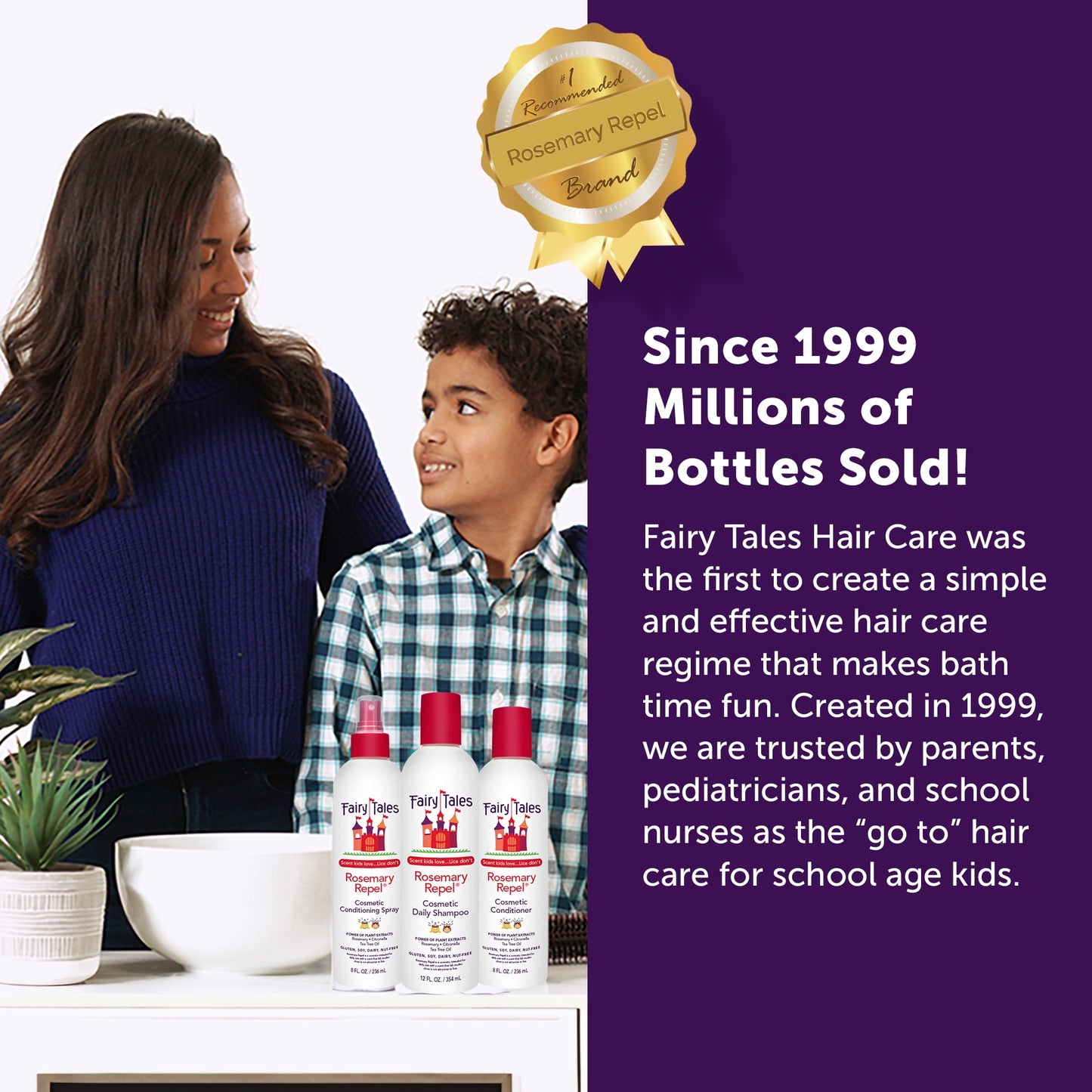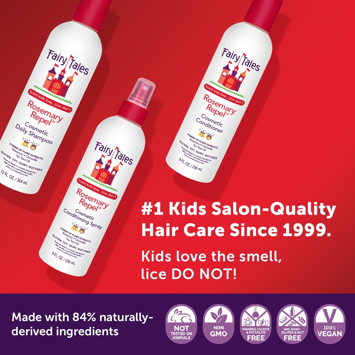 Transform your child's daily hair care routine with Fairy Tales Rosemary Repel® Conditioning Spray—a gentle, nourishing essential designed to make detangling a breeze. Whether spritzed on wet or dry hair, this versatile spray smooths knots and delivers hydration, leaving hair irresistibly soft and easy to manage. Infused with a unique blend of rosemary, citronella, tea tree, geranium, and peppermint oils, it offers a fresh, invigorating scent that kids love, but lice do not. Enriched with aloe, Vitamin B5, and amaranth protein, this formula strengthens and moisturizes strands while promoting a healthy scalp. Free from harsh chemicals and common allergens like sulfates, parabens, phthalates, gluten, soy, dairy, and nuts, it’s perfect for everyday use on even the most sensitive scalps. Fairy Tales Rosemary Repel® Conditioning Spray is your family’s go-to for smooth, tangle-free hair with the added peace of mind of safe, naturally derived ingredients. Fairy Tales Hair Care has been naturally caring for and trusted by families since 1999 for gentle yet effective hair care solutions. Our growing lines of products include Rosemary Repel, Tangle Tamer, Curly Q, Daily Cleanse, and the Sun & Swim line.