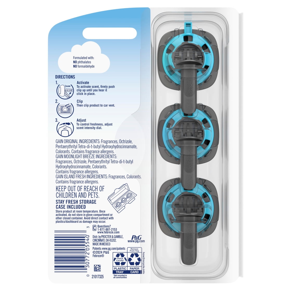 Kick car odors to the curb and enjoy up to 40 days of consistent scent with Febreze Car Vent Clips. While other car refreshers start off like a floral punch in the face, Febreze smells just right, right away. You'll get that first-day Febreze fresh for up to 40 days courtesy of its patented Steady Release Technology. This car air freshener vent clip is a breeze to install: Just unfold the clip until you hear a click, then clip it to your vent. It uses your car's fan to circulate an even scent through your entire vehicle. Get ready to hit the road, Gainiacs: This variety pack lets you enjoy all your favorite Gain scents while on the go, featuring Gain Original, Moonlight Breeze, and Island Fresh. These tiny car deodorizers are made with odor fighters that fight any car stink with a scent that lasts. So forget those overwhelming, fade-too-soon fresheners and enhance every drive with the long-lasting freshness of Febreze Car. Want a fresh that lasts at home, too? Try Febreze Fade Defy PLUG.