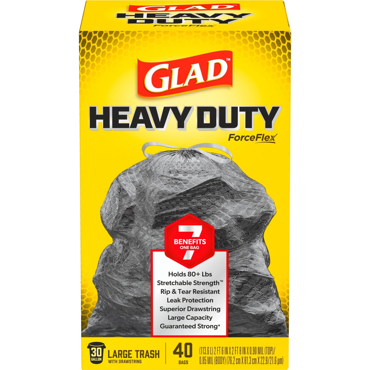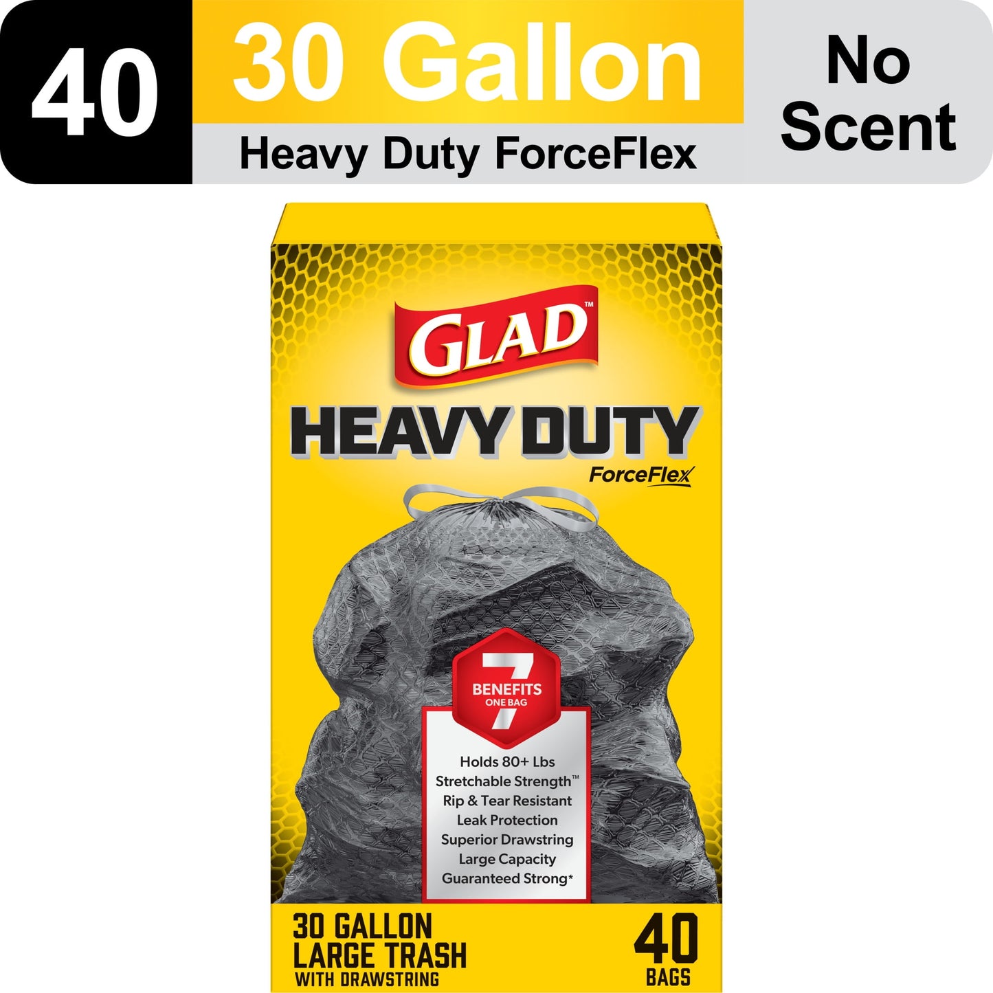- HEAVY DUTY TRASH BAGS: Forty (40) 30-gallon Glad ForceFlex Heavy Duty Large Trash Bags that can handle the toughest jobs indoors and outdoors