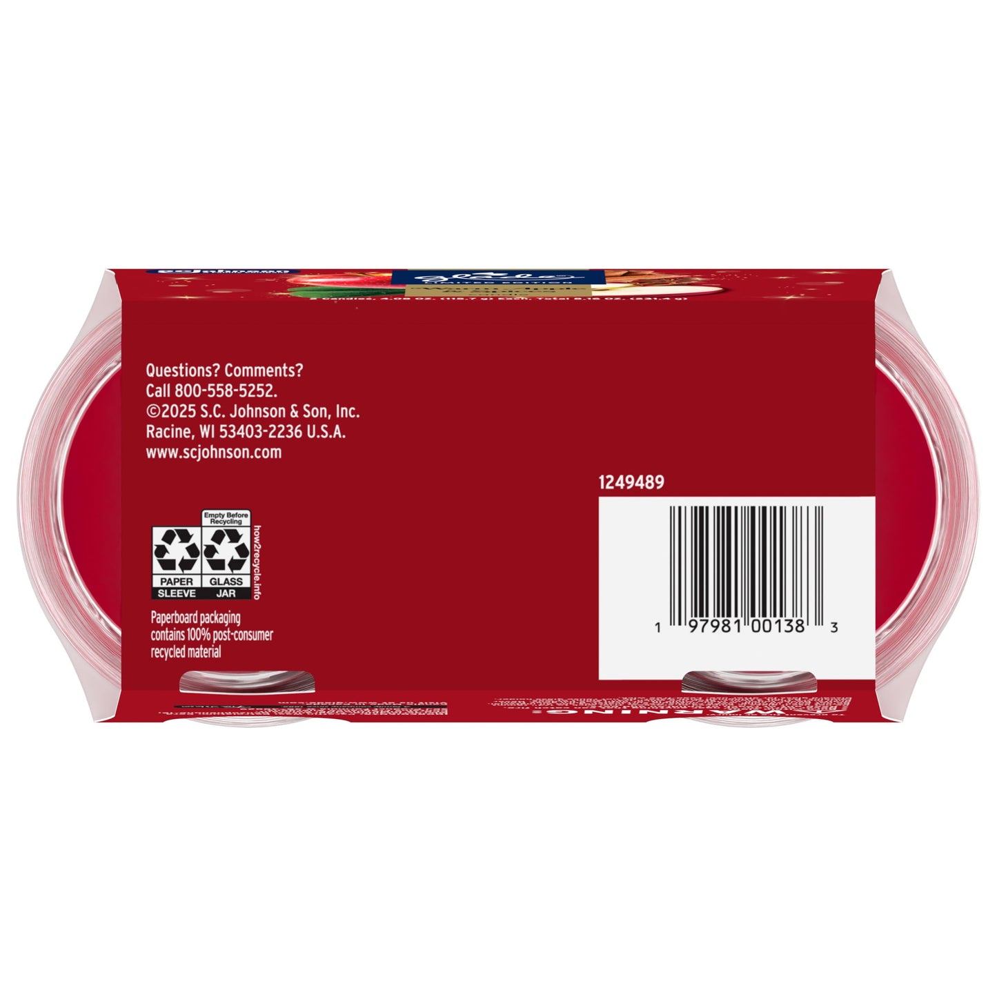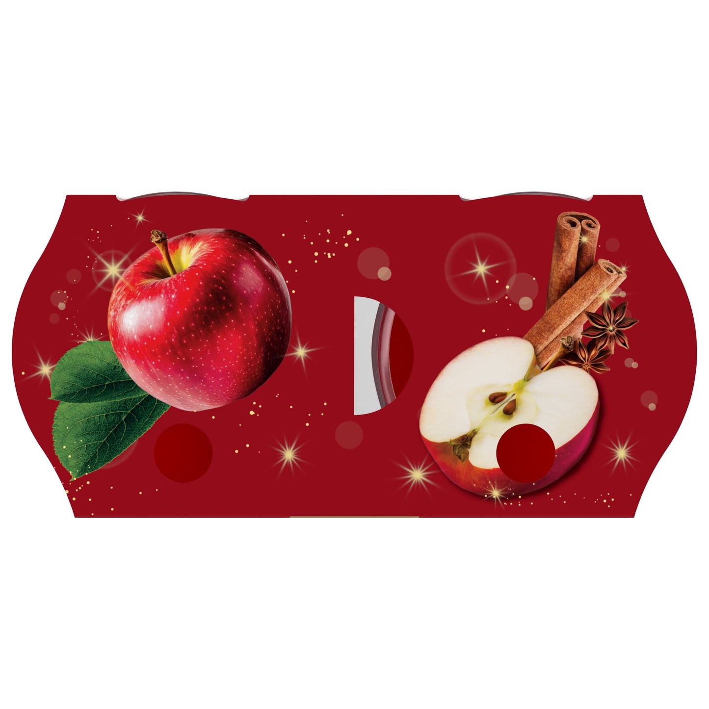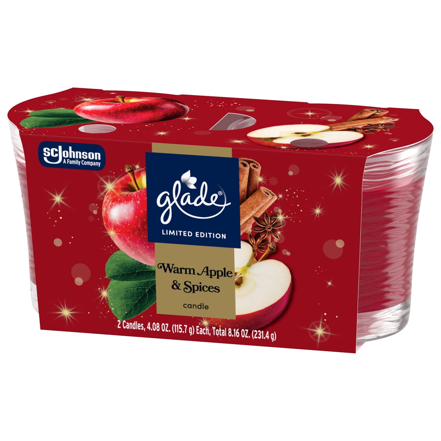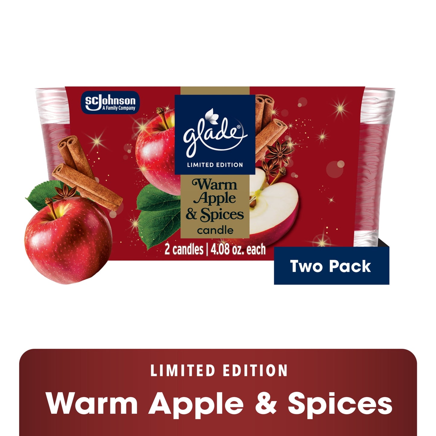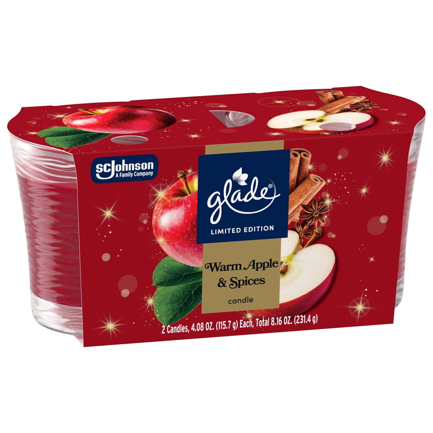• Glade® Warm Apple & Spices small jar candle infused with honeycrisp apple, cinammon sugar, and sweet vanilla bean