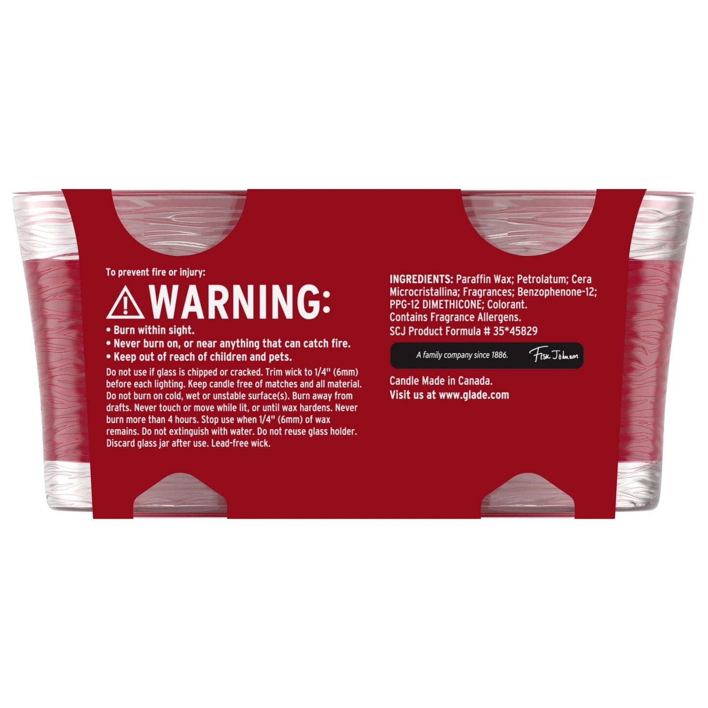 Bring on festive feels with the masterfully crafted fragrance, Warm Apple & Spices, by Glade®. Lighting a single-wick winter candle is your new go-to for igniting a self-care routine with bold fragrances and more glow. These small jar candles fill your space with a captivating scent, perfect for moments of relaxation like enjoying a book or indulging in a luxurious bath. The fragrance, infused with essential oils, features notes of honeycrisp apple, cinammon sugar, and sweet vanilla bean. Our scented candles are made without phthalates, parabens, formaldehyde and nitro musks. Explore the Falliday Glade® candle collection and find the perfect scent treat to enhance your self-care routine. To get the most out of your fall scented candle, burn it for two to four hours at a time, and trim the wick to 1/4 inch before each use. Ensure the wax is clear of debris before lighting, and allow it to cool and harden before handling. For optimal performance, keep burning candles away from drafts, vents and air currents. Stop using your Glade® Jar Candle when only 1/4 inch of wax remains, and always place it on a stable, heat-resistant surface. Never leave burning candles unattended; keep them out of reach of children, pets and flammable materials.