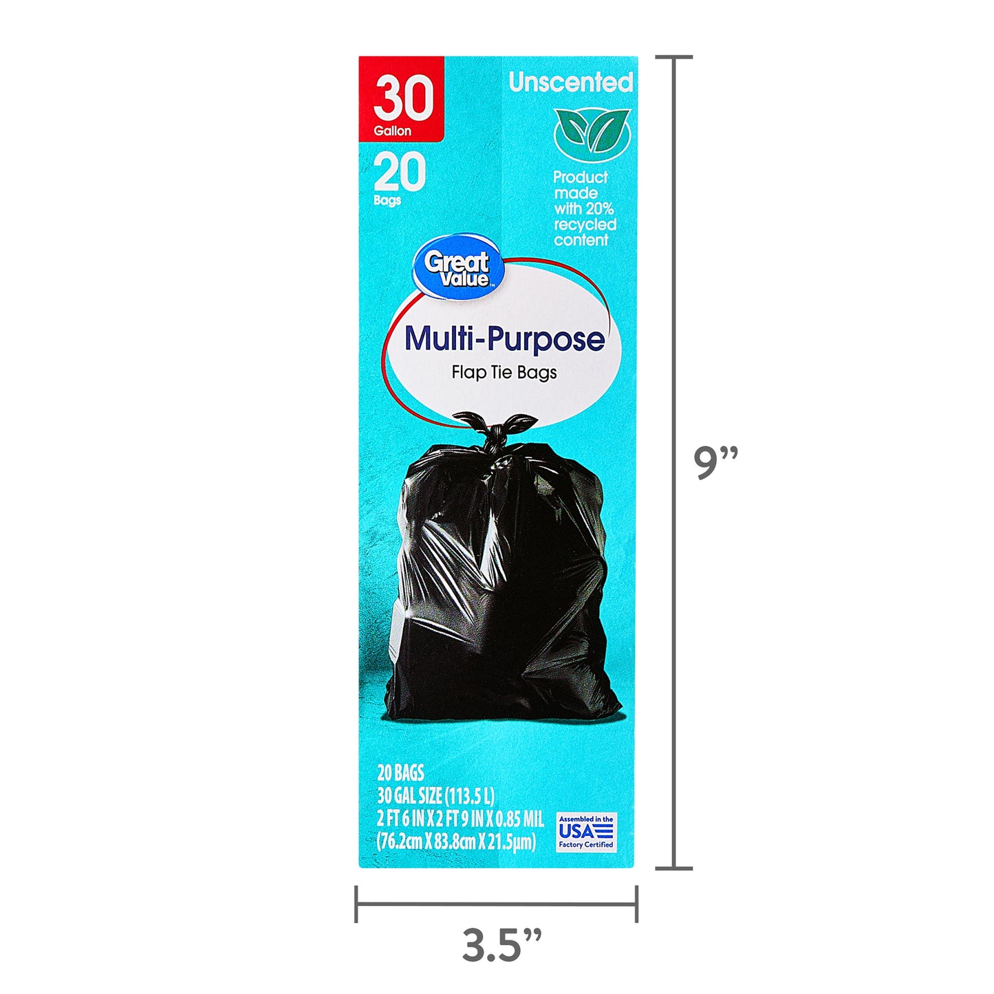 Great Value 30-Gallon Large Flap Tie Trash Bags – Durable Household Garbage Bags, 20 Count