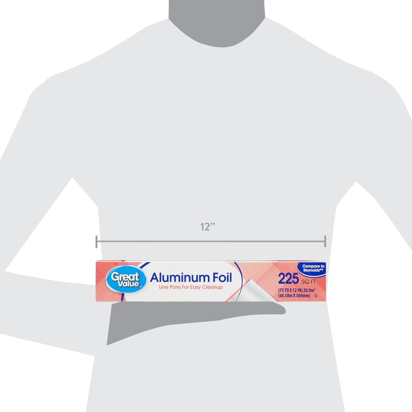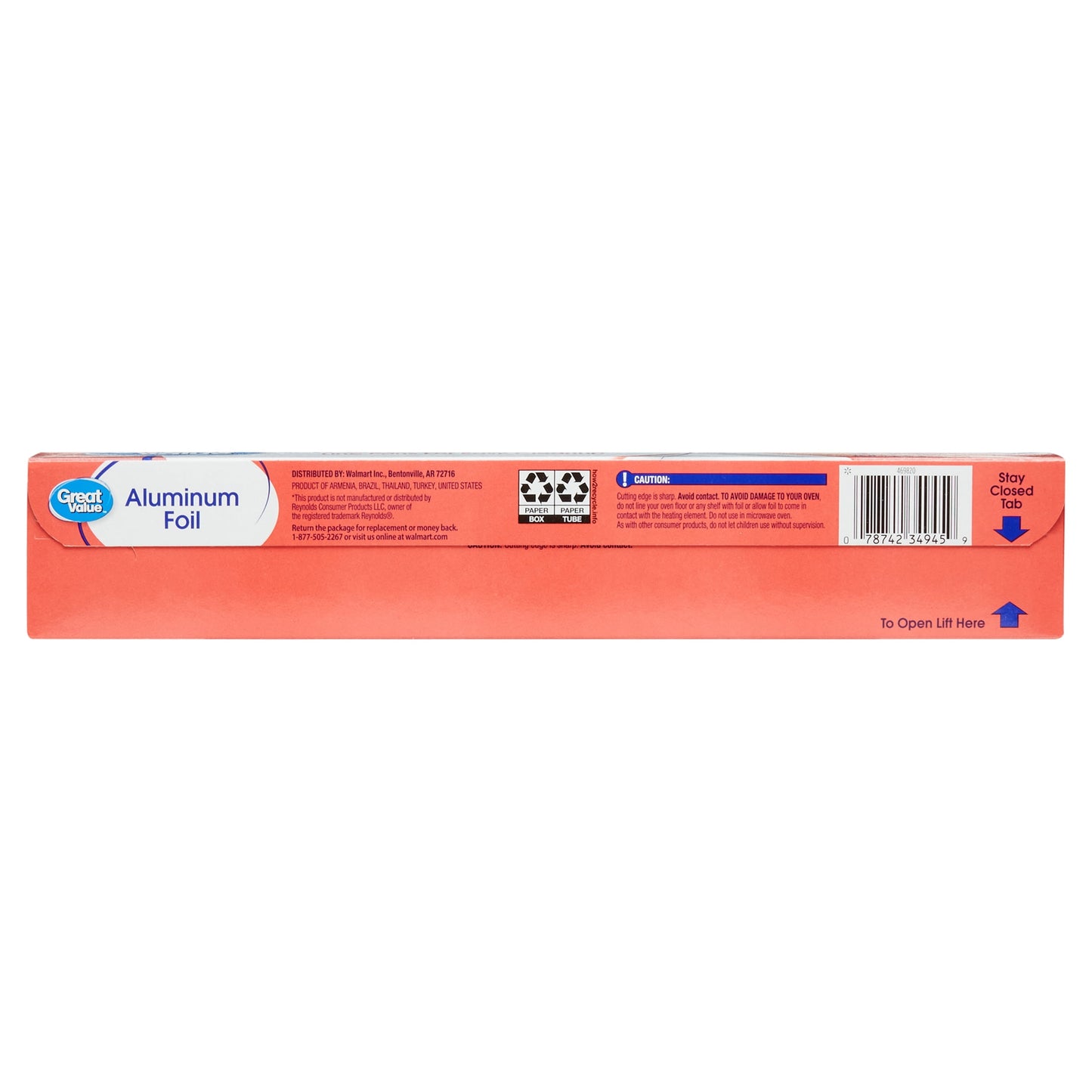Streamline your cooking, grilling, and baking with our Great Value Aluminum Foil. Tough enough to withstand the heat of your grill or oven, you can use this foil as an insulator to keep prepared food toasty or use it as a pan liner to make after-dinner clean-up a breeze. If you're looking for an alternate way to safely store your leftovers, just wrap them up in our aluminum foil prior to freezing or refrigeration for a quick and convenient storage solution. Each box includes locking ends and a sharp cutting edge that makes it super simple to grab the right amount of foil for the project at hand. Plus, the stay-closed tab keeps your foil box closed while not in use. Discover all your new cooking, grilling, and baking possibilities with our Great Value Aluminum Foil. Great Value products provide families with affordable, high-quality grocery and household consumable options.