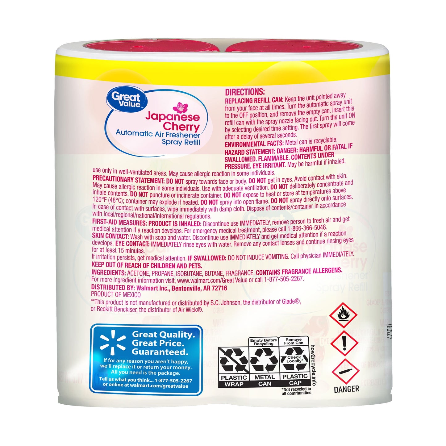 Turn your house atmosphere into a whole experience with Great Value® Cherry Blossom Automatic Air Freshener Spray Refill Twin Pack. Compatible with Glade® and Air Wick® dispensers. Each of these air freshener spray refills will permeate your space for up to 60 days (Total of 120 days), full of delightful scent, your friends and family will surely compliment. Great Value® provides you with a wide range of affordable high-quality products spanning categories from grocery to household consumable options. Our products are conveniently available in Walmart stores nationwide as well as online, allowing you great money savings and stocking-up options. When spraying ensure it is at least 6 feet away from the floor level, and do not activate near any furniture, electronics, or close to any flame source.