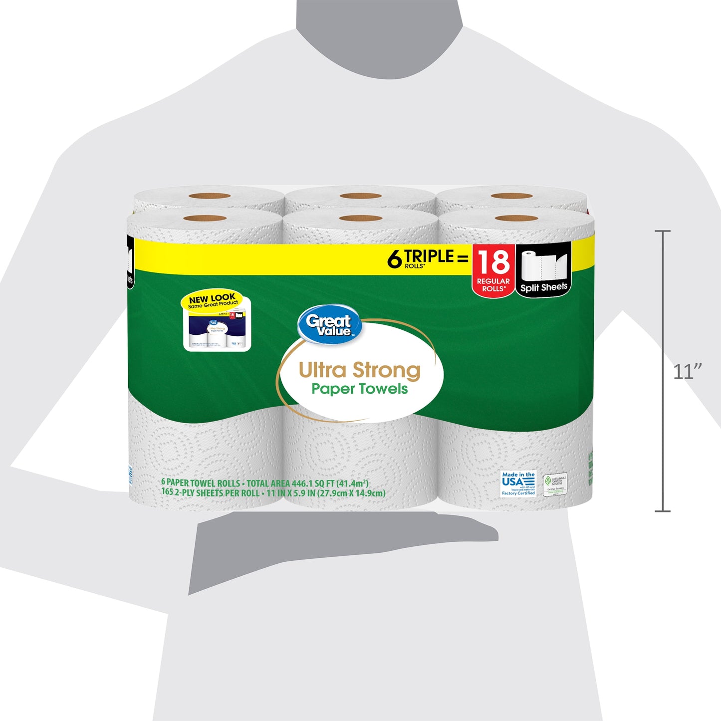 Great Value Ultra Strong Paper Towels feature premium 2-ply paper towel sheets that are super strong and absorbent making them the ideal paper towel for your home. Our towel has the right combination of soft texture with durable strength that you've been looking for. This paper towel pack contains 6 triple rolls which gives you three times as many sheets as regular rolls, so you can tackle three times as many messes. The split sheets give you the option to choose the amount you need when cleaning up spills, dirt, grime, food waste, and more. The rolls are conveniently sized to easily fit in any kitchen, bathroom, workspace, etc. Each paper towel roll includes 165 sheets with a beautifully embossed pattern that enhances the look of your kitchen and home. Each pack includes 6 Triple Rolls with 165 2-ply sheets per roll. Experience the difference with Great Value Ultra Strong Paper Towels. Great Value offers affordable, high-quality paper towel options, conveniently available online or at Walmart stores nationwide. Enjoy reliable performance and save on everyday essentials with these large paper towels, all backed by the trusted Great Value Guarantee.