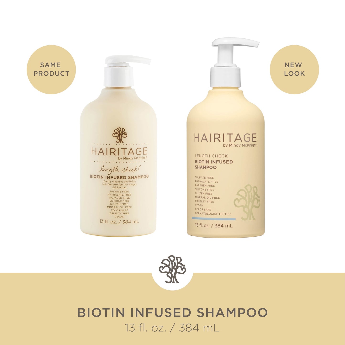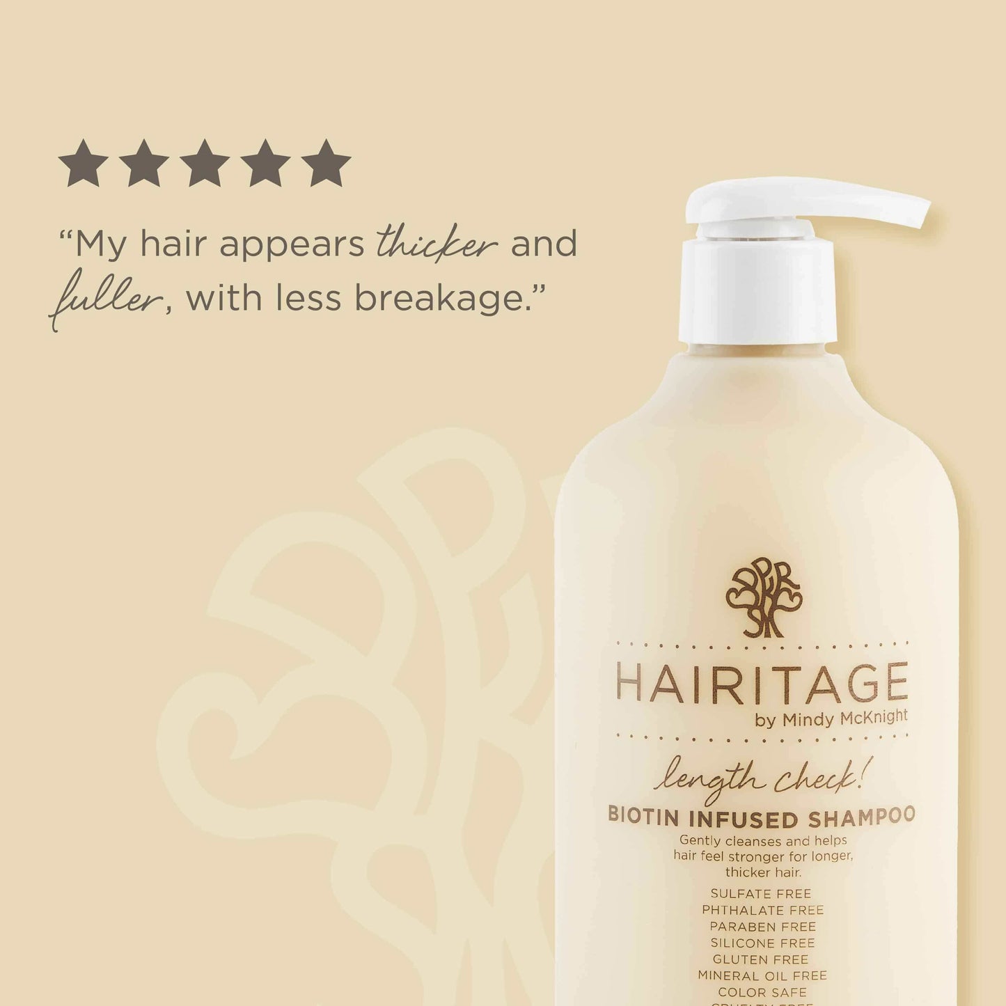 Length Check! Discover the secret to luxurious hair with the Hairitage Length Check Biotin + Jamaican Black Castor Oil Shampoo and Conditioner set for thicker hair. This dynamic duo is intricately formulated to cater to all hair types from 1A to 4C, ensuring a complete hair care solution. This gentle, hydrating shampoo cleanses your hair without stripping, powered by nourishing ingredients like Biotin, Jamaican Black Castor Oil, and Marshmallow Root. It works to fortify strands, minimize breakage, and promote a thicker, fuller appearance. The matching conditioner complements the shampoo, leaving your hair strengthened, visibly longer, and voluminous, while also ensuring it stays moisturized, supple, and easily detangled. Embrace the Hairitage brand's commitment to hair wellness, featuring products free from SLS/SLES, phthalates, parabens, silicones, gluten, and mineral oil. This vegan, color-safe set is cruelty-free and designed to aid in your journey to achieving healthy, flourishing locks.