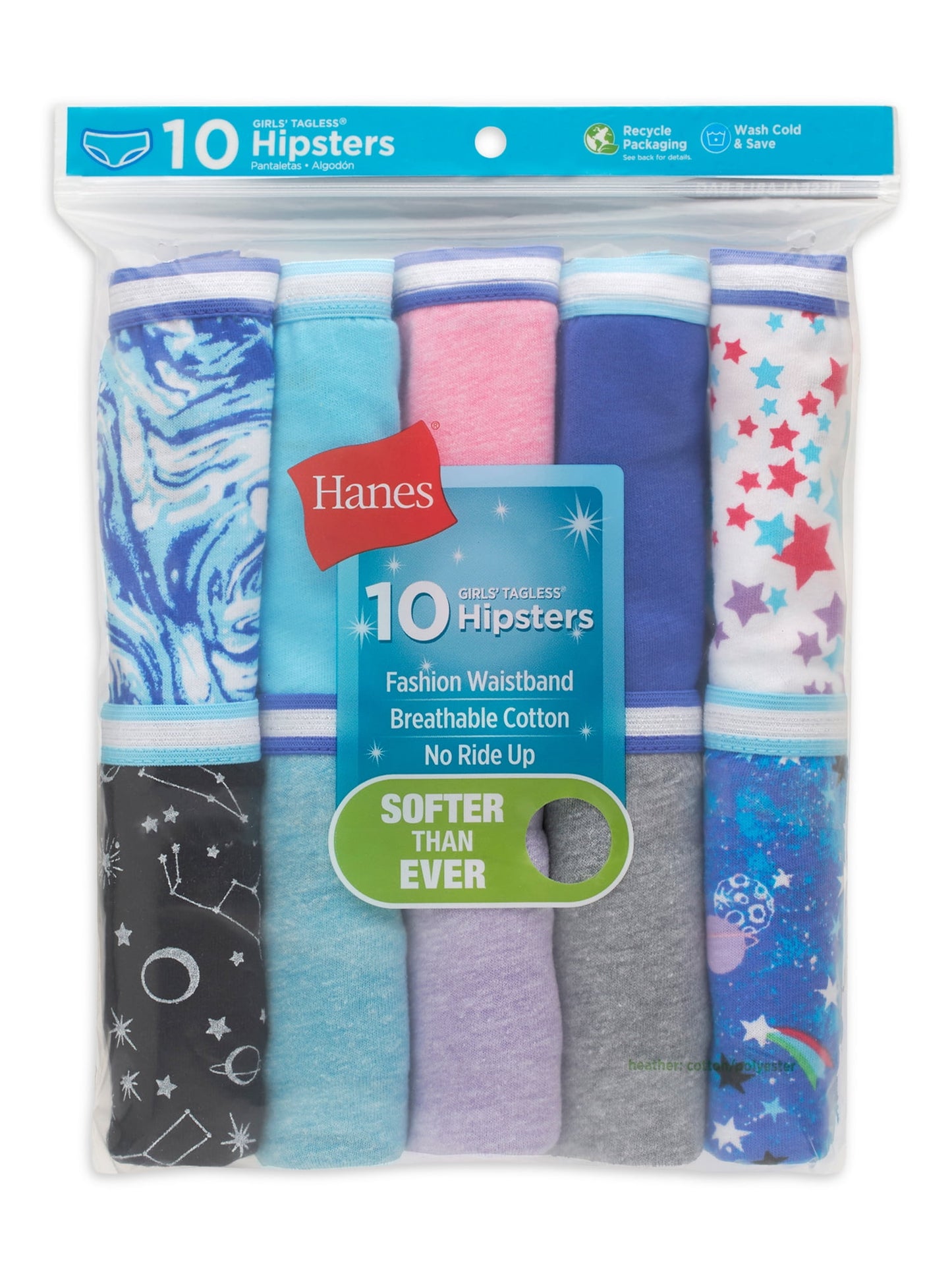 The Hanes Girls’ Sparkle Cotton Hipster 10-Pack brings everyday comfort with a touch of fun. Made with soft, breathable cotton fabric, these hipsters keep her cool and comfortable whether at school, play, or bedtime.