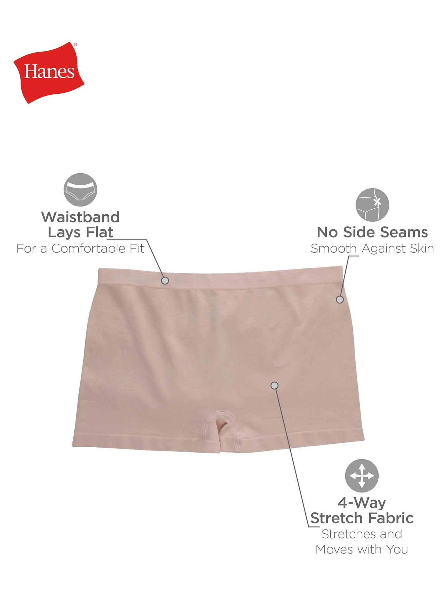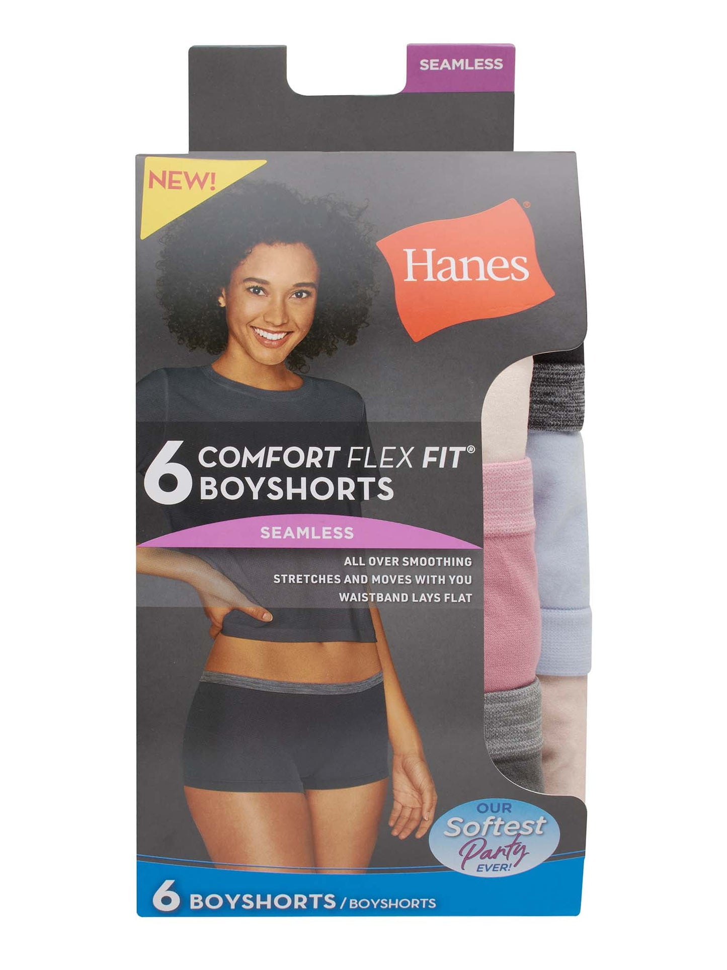 Built for movement, Hanes® women’s boyshort underwear is crafted from Comfort Flex Fit® 4-way stretch fabric for a comfortable fit. Moisture-wicking technology works to keep you feeling your best, even during your most active days. The seamless design of these women's boxers features no-ride-up leg bands, so you can move with ease. Accented with a smooth Tagless® interior, this assorted boyshort underwear is available in a convenient 6-pack for stock-up ease.
