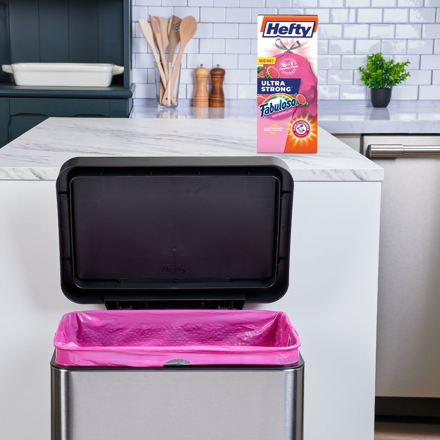 Keep your kitchen clean and odor-free with Hefty Ultra Strong 13-gallon trash bags. Tall, durable, pink design with Fabuloso Watermelon freshness—40 bags per pack.