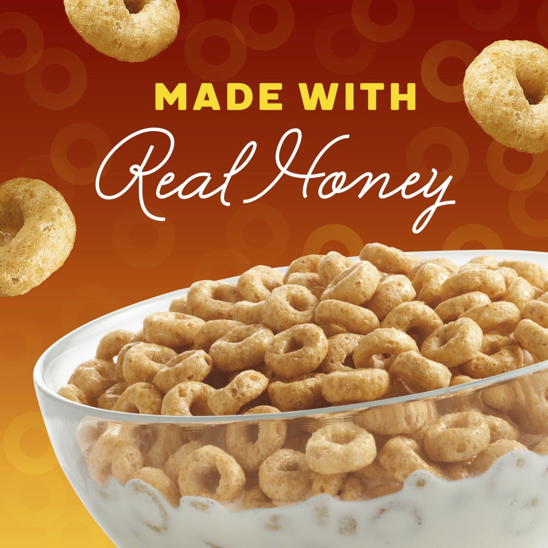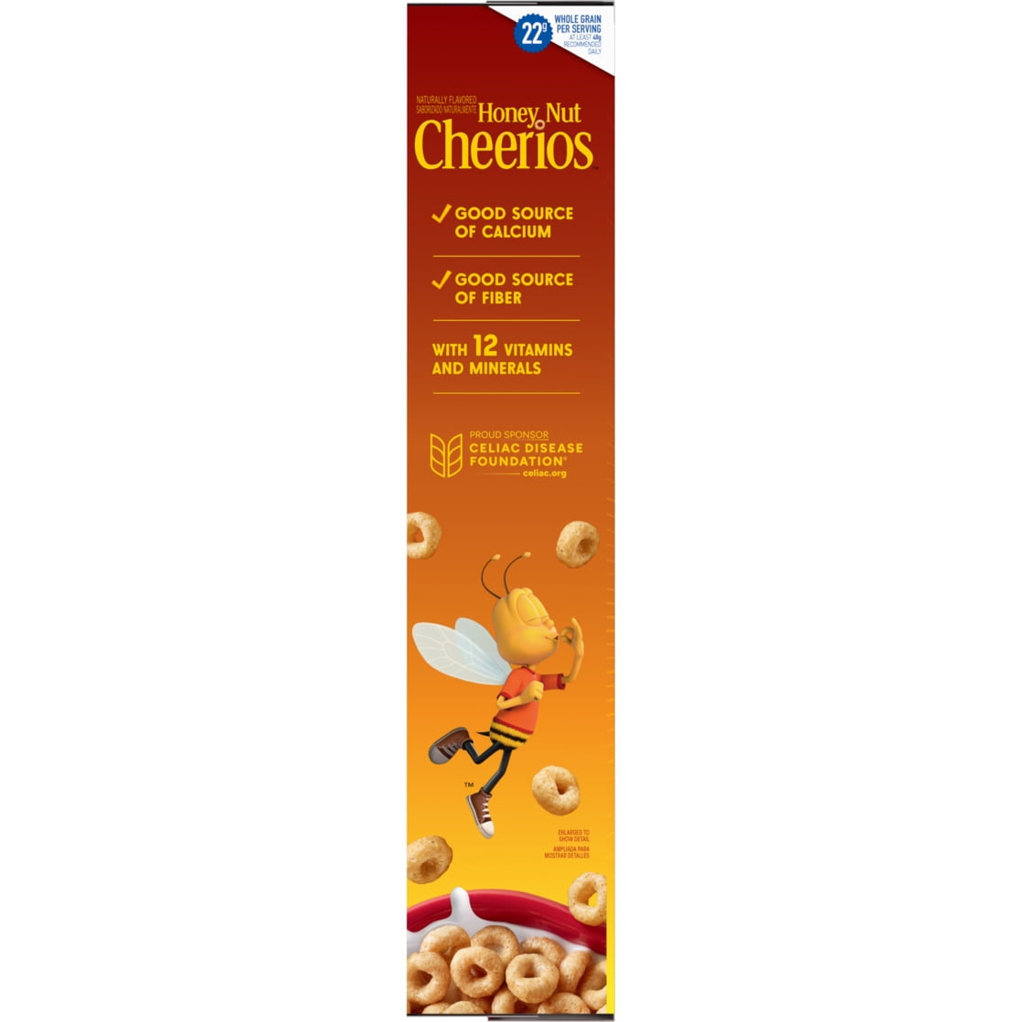 Honey Nut Cheerios Cereal is un-bee-lievably delicious! Every box of this gluten free, sweetened, whole grain oat cereal brings the taste of real honey and natural almond flavor to your family table. Honey Nut Cheerios can help lower cholesterol* as part of a heart healthy diet. *Three grams of soluble fiber daily from whole grain oat foods, like Honey Nut Cheerios Cereal, in a diet low in saturated fat and cholesterol, may reduce the risk of heart disease. Honey Nut Cheerios Cereal provides .75g per serving. Each serving of Honey Nut Cheerios provides 22g of whole grain (at least 48g recommended daily), 12 vitamins and minerals, and has a good source of both calcium and fiber. Beyond a quick part of breakfast for adults or kids, these yummy whole grain cereal Os made with oats, make an easy, gluten free snack by the handful. Pack some crispy cereal in a lunch box for a sweet treat. Or use these honey cereal Os as an ingredient in your favorite cereal bars recipe. However you enjoy Honey Nut Cheerios, it's a part of General Mills breakfast cereals, spreading goodness from tots to grown-ups. Contains one cardboard box of crunchy Honey Nut Cheerios, Heart Healthy Gluten Free Breakfast Cereal, Family Size, 18.8 oz; perfect for instant snacking, or a part of breakfast and meals.