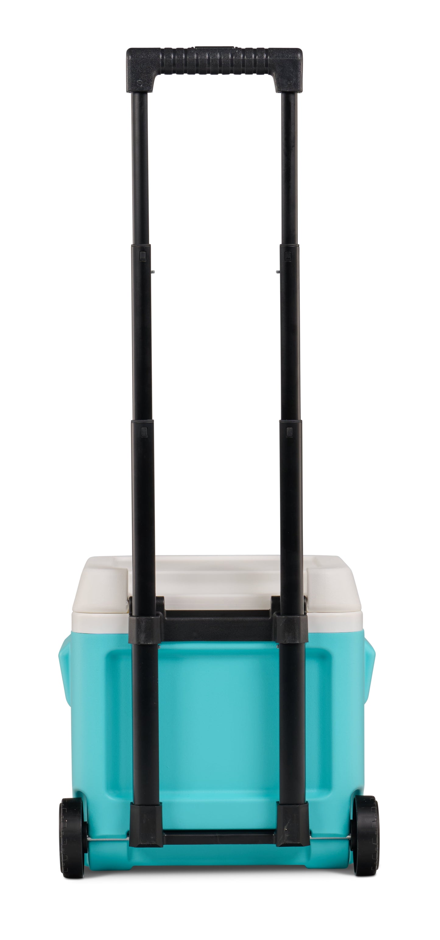 - Locking, telescoping handle enables cooler to be pushed or pulled
