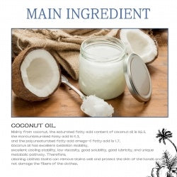 Our laundry soap contains coconut oil. It cleans with a phosphorus-free formula, removes stains and has a long-lasting smell.