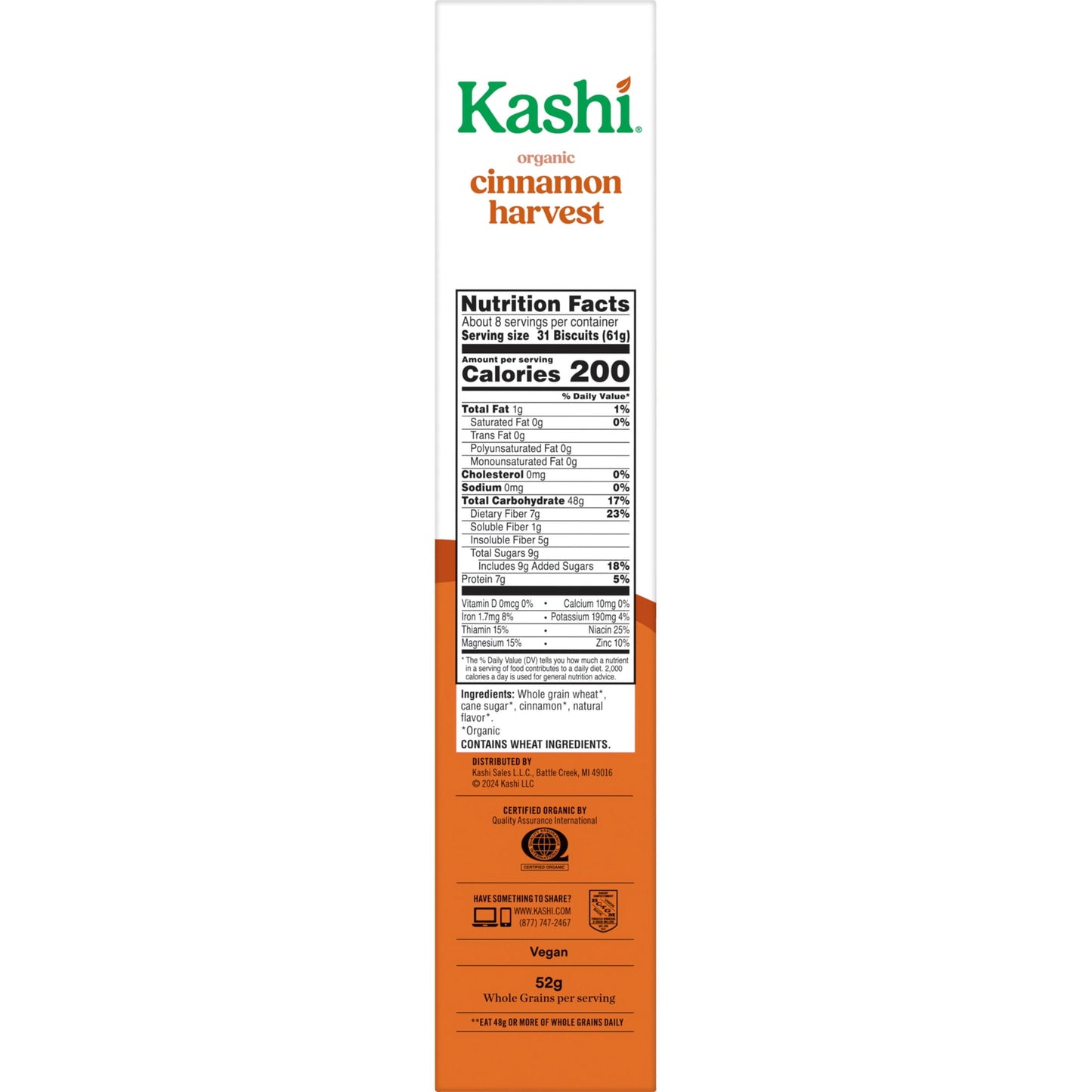 Wake up to satisfyingly sweet cinnamon spice with Kashi Cinnamon Harvest cereal. Fill your morning with a bowlful of hearty, whole grain biscuits and real cinnamon that the whole family will love. This breakfast cereal contains 7g of protein (5% daily value per serving) and 7g of fiber per serving. Organic, vegan, and Non-GMO Project Verified, it combines delicious, high-quality ingredients that deliver tasty nutrition. It’s a quick and easy way to brighten your morning; Pack reusable baggies of this fiber cereal in your backpack for a tasty treat between meals. Made with simply 4 ingredients, each nourishing bite of this cereal packs in cinnamon-tastic flavor and ingredients you can feel good about. Kids and adults alike love the shredded wheat biscuits with a touch of cinnamon in each spoonful with your favorite milk. Whether you’re starting or ending your day, Kashi Cinnamon Harvest cereal is a wholesome choice.