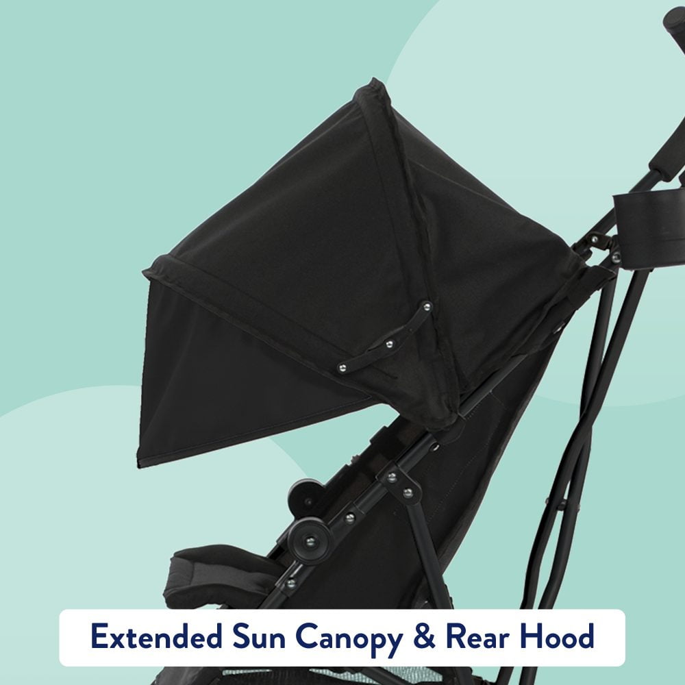 - Extended sun canopy and rear hood provide more sun coverage than most umbrella strollers