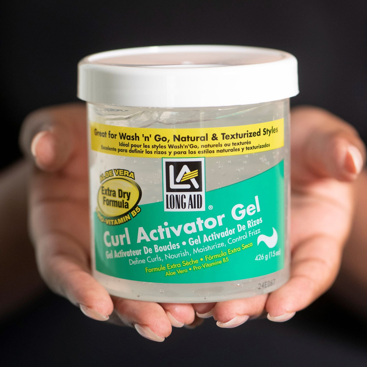 Our Long Aid Curl Activator Styling Gel Extra Hold nourishes thirsty, lifeless curls and waves while providing all-day hold to 3b-4c textured hair. The addition of Aloe and Glycerin in this unique formula conditions and restores moisture to dry or damaged hair while Vitamin B5 creates a barrier helping to prevent moisture loss during the day. This powerful combination controls frizz, defines natural curls and waves while delivering long-lasting curl memory. Great for natural hair styles. Gentle enough to use daily.