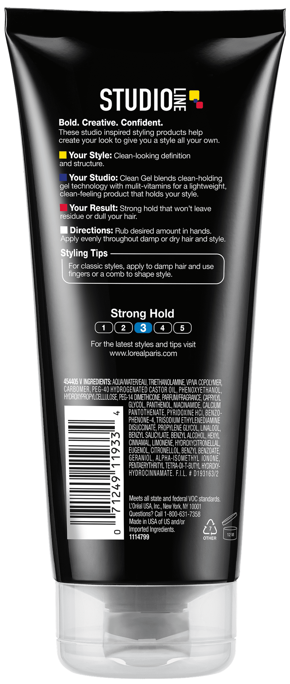 L'Oreal Paris Studio Line flexible Control Strong Hold Hair Styling Gel, This gel blends clean-holding gel technology with multi-vitamins for a lightweight, clean-feeling product that holds your style. Strong hold that won't leave residue or dull your hair. Meets all state and federal VOC standards. Get a clean, natural look with L'Oreal Paris Studio Clean Gel. This defining hair gel provides clean definition and flexible control without the buildup or stiffness. Perfect for medium length hairstyles and short hairstyles. Clean Look with Definition and Structure. No Residue, No Build-Up. Strong Hold Hair Gel. Lightweight, Clean FeelRub desired amount in hands. For classic styles, apply to damp hair and use fingers or a comb to shape style.