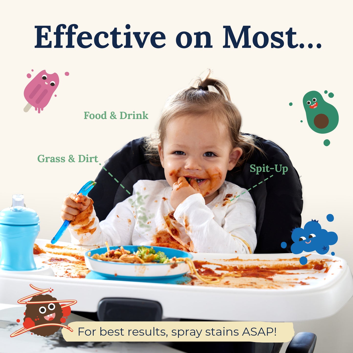 - Effective on Baby & Everyday Messes From baby food to fruit juice, formula, ketchup, and even tough stains like blood, this spray works wonders on both fresh spills and not-so-fresh surprises.