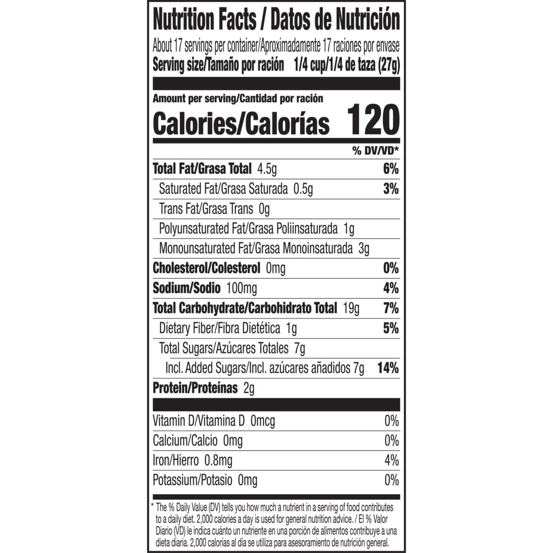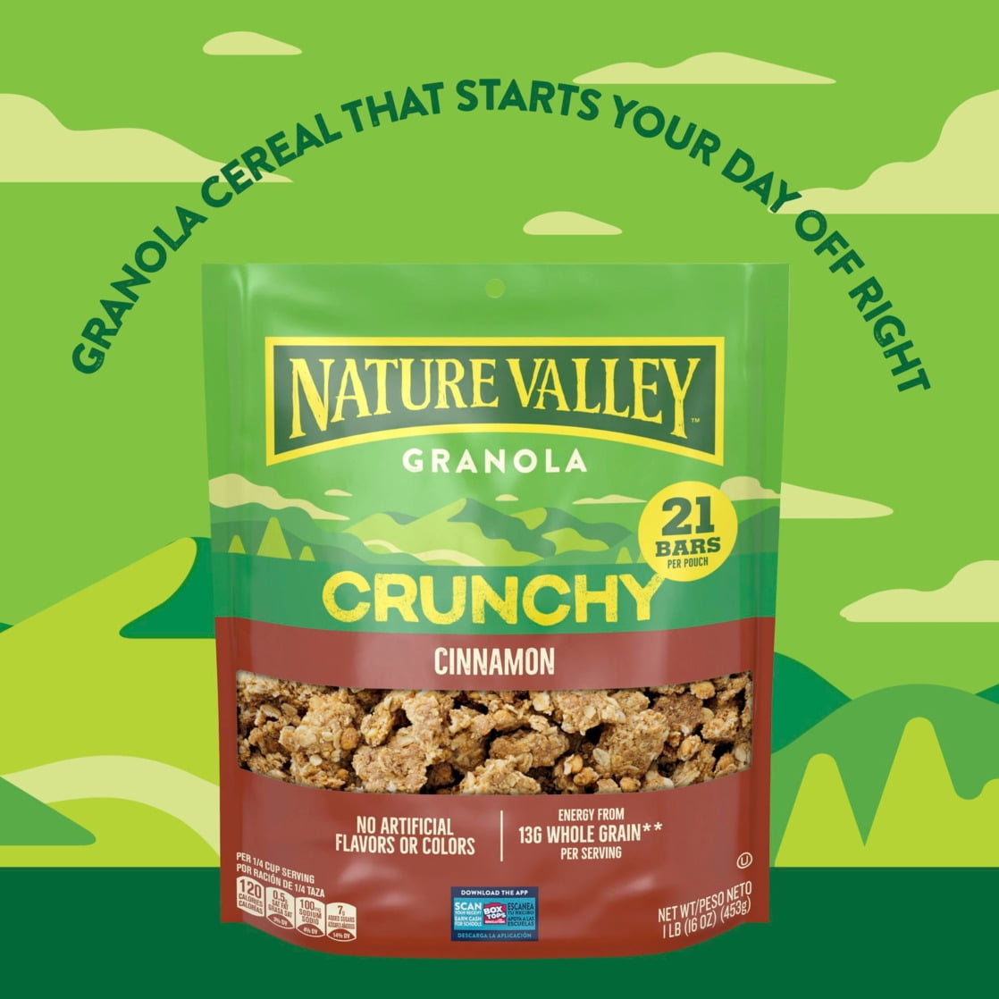 Fuel your adventures any time, any place with Nature Valley Crunchy Cinnamon Granola. This 16 oz pouch has 21 bars' worth of granola. The taste of cinnamon and the goodness of granola made with whole grain oats are a wholesome way to kick-start your day. Each serving provides energy from 13g whole grain (at least 48g recommended daily). Plus, the crunchy cinnamon granola clusters have no artificial flavors or colors, and no high fructose corn syrup. So whether you enjoy a bowlful as a breakfast cereal or take along the pouch for family snacks on the run, this cinnamon granola delivers on the go energy. Add your own fruit and nut combination for DIY trail mix. Sprinkle the Nature Valley granola clusters over a yogurt parfait or acai bowl for serious crunch. This pouch of loose granola cereal is resealable for easy school snacks or part of breakfast on the go. At Nature Valley, we believe that what you put in is what you get out. So wherever the moment takes you and your family, you can rely on our great-tasting snacks to help keep you going, whenever and wherever you need it. Contains one plastic pouch of crunchy Nature Valley Crunchy Cinnamon Granola, 16 oz; perfect for instant snacking, or a part of breakfast and meals.