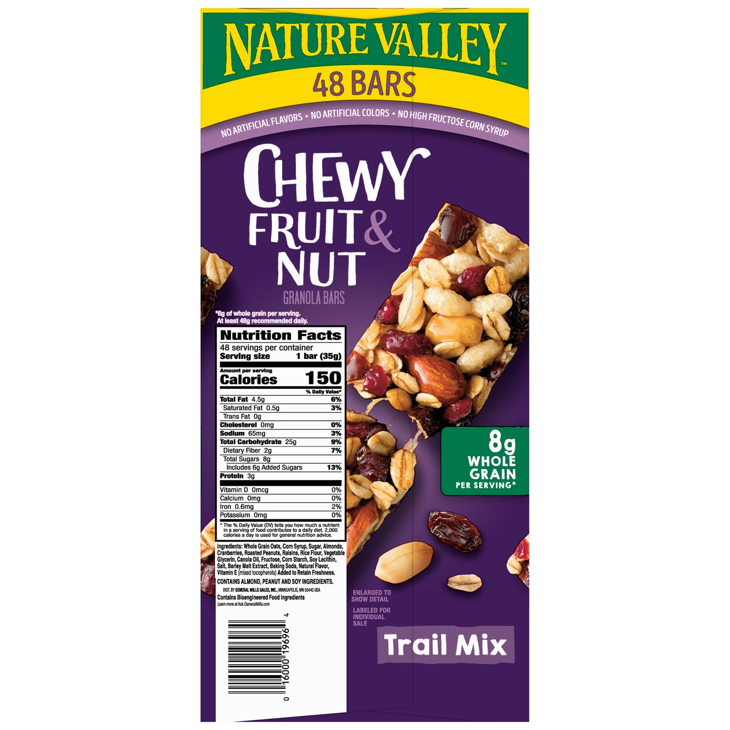 Enjoy a wholesome snack with Nature Valley Fruit & Nut Chewy Granola Bars, Trail Mix, 1.2 oz, 48-count. Made with a blend of whole grain oats, crunchy peanuts, and real raisins, these chewy granola bars deliver a perfect balance of sweet and salty flavors.
