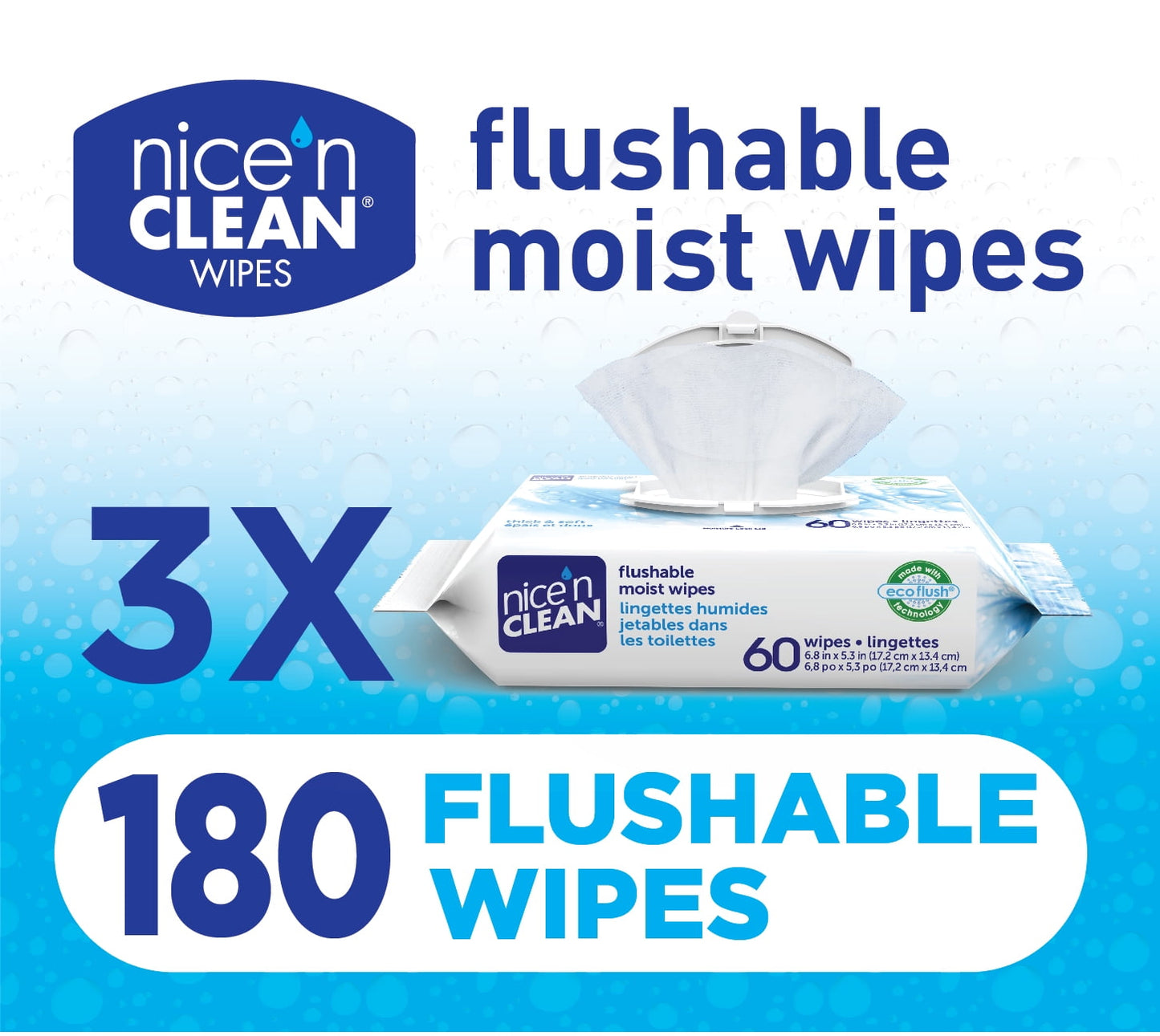 Nice N Clean Plant-Based Flushable Wet Wipes, 3 Flip-Top Packs (180 Wipes) – Gentle & Eco-Friendly