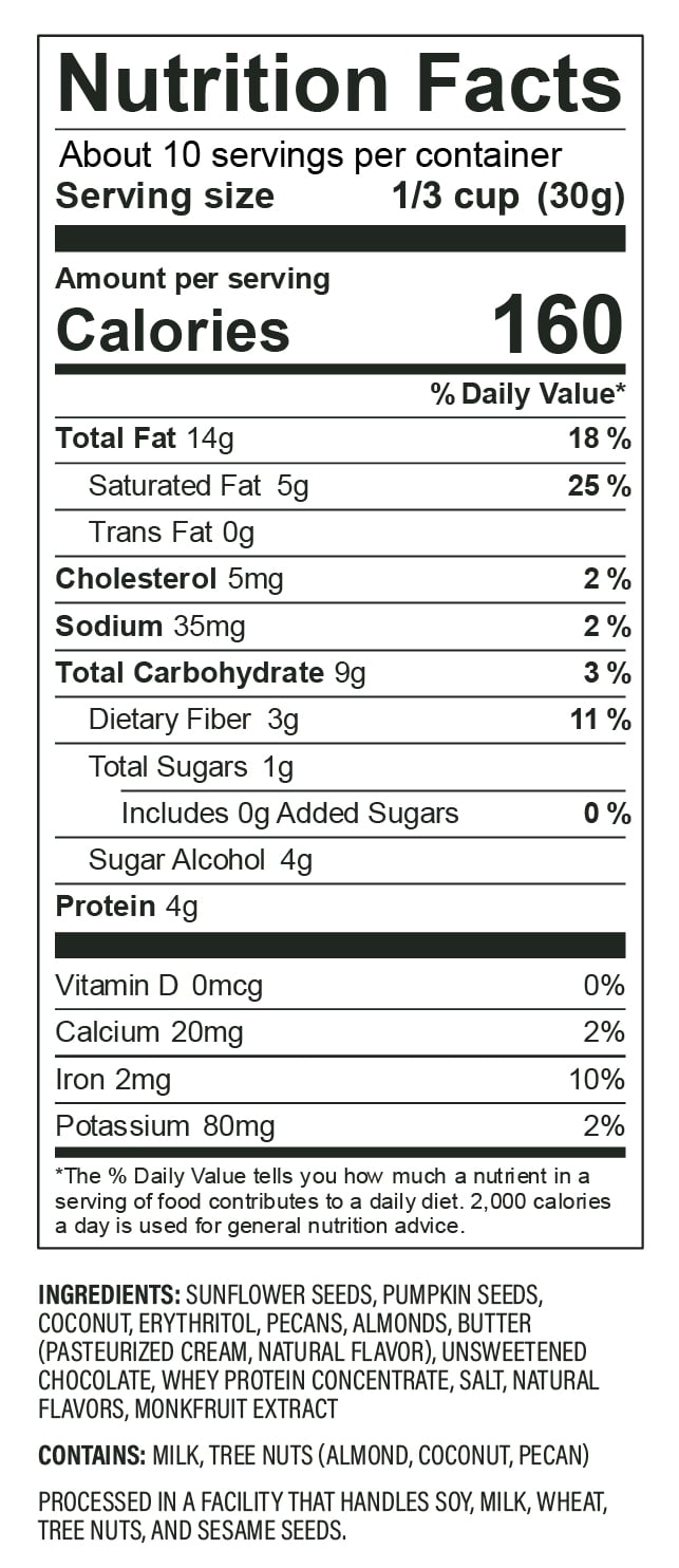 This one’s for our chocolate lovers! Low-sugar, low-carb as always – so no worries there. Our signature blend of nuts and seeds, paired with unsweetened chocolate and naturally sweet monk fruit. A perfect pair for your favorite nut butter or a healthy topping for your favorite dessert – you really can’t go wrong.