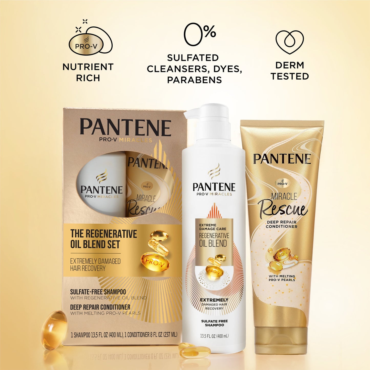 THE REGENERATIVE OIL BLEND SET FOR EXTREMELY DAMAGED HAIR RECOVERYReplenish lost nutrients to help hair revocer from the inside out for softer, more resilient hair with each wash.LUXURY HAIR REPAIR WITHOUT THE LUXURY PRICE TAGDirections:STEP 1 - WASH IN NUTRIENTS. Cleanse and restore the look and feel of extremely damaged hair with our argan and jojoba oil enriched Regenerative Oil Blend Shampoo with a luxurious tropical cream and sandalwood scent.STEP 2 - MELT AWAY VISIBLE DAMAGE. Repair, nourish and protect hair from the inside out with a deep conditioning formula infused with Melting Pro-V Pearls with an elegant inviting scent.
