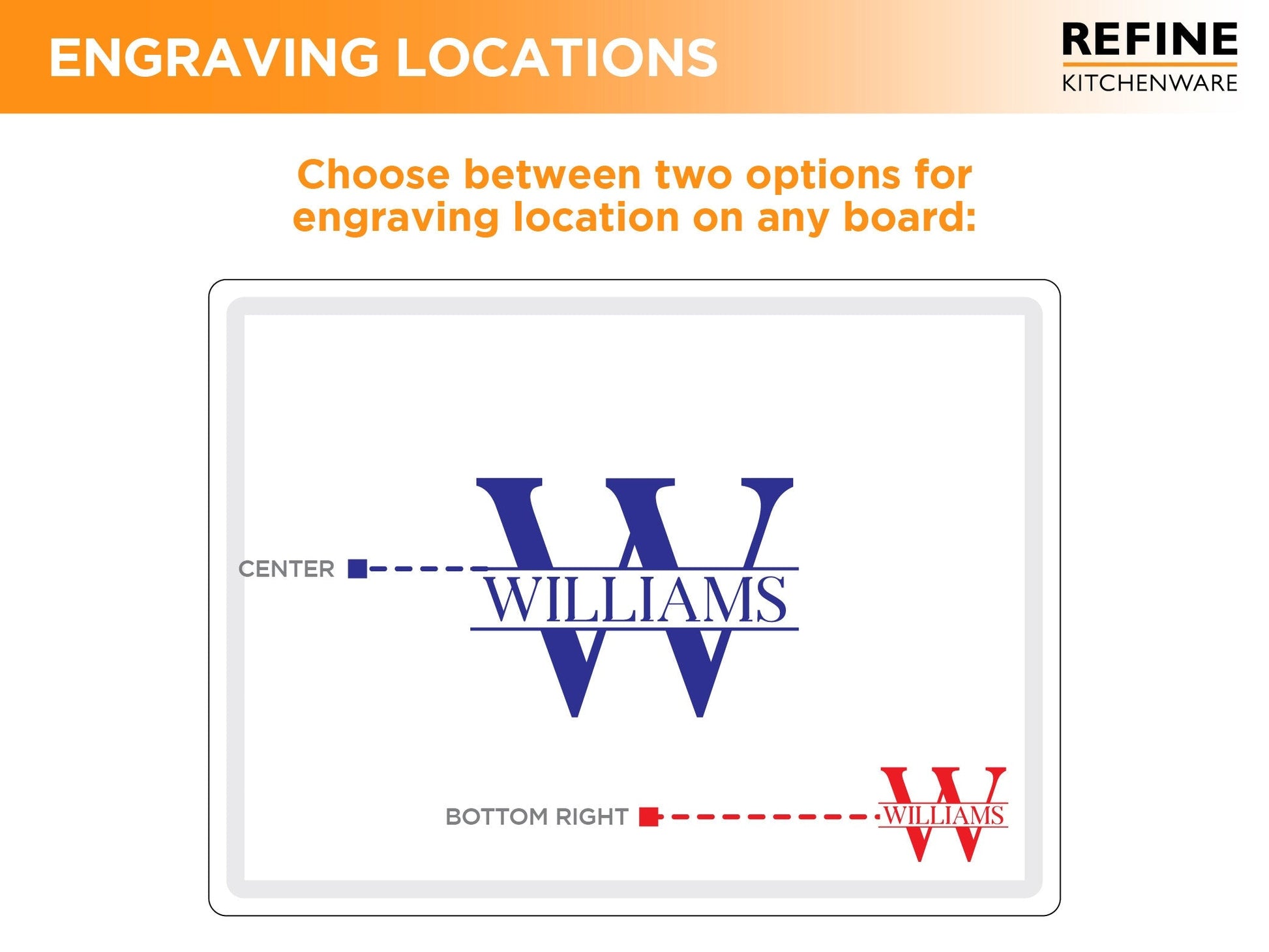 ❷ Choose between having your personalization engraved to the center or bottom right corner of the board. Check the photos on this listing to see size references for center or bottom right engravings.