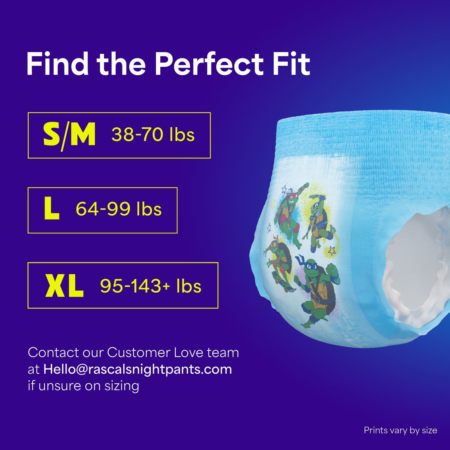 Rascals Night Pants for Boys, S/M (43–68 lbs), 44 Count – Absorbent Bedwetting Underwear with Teenage Mutant Ninja Turtles